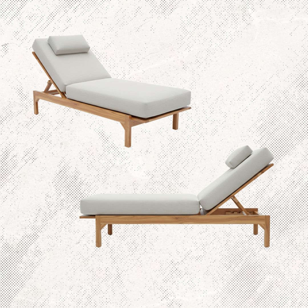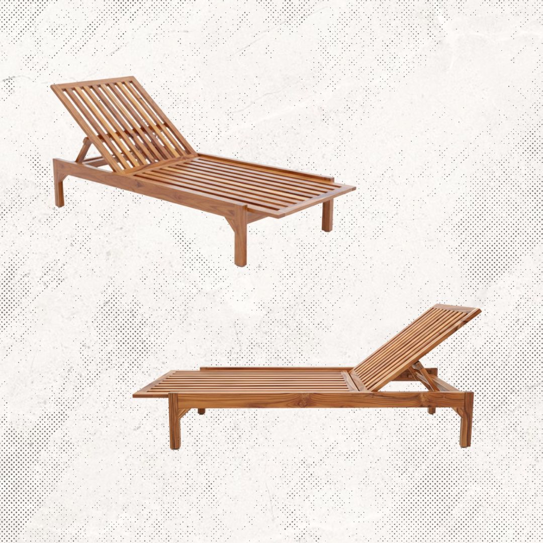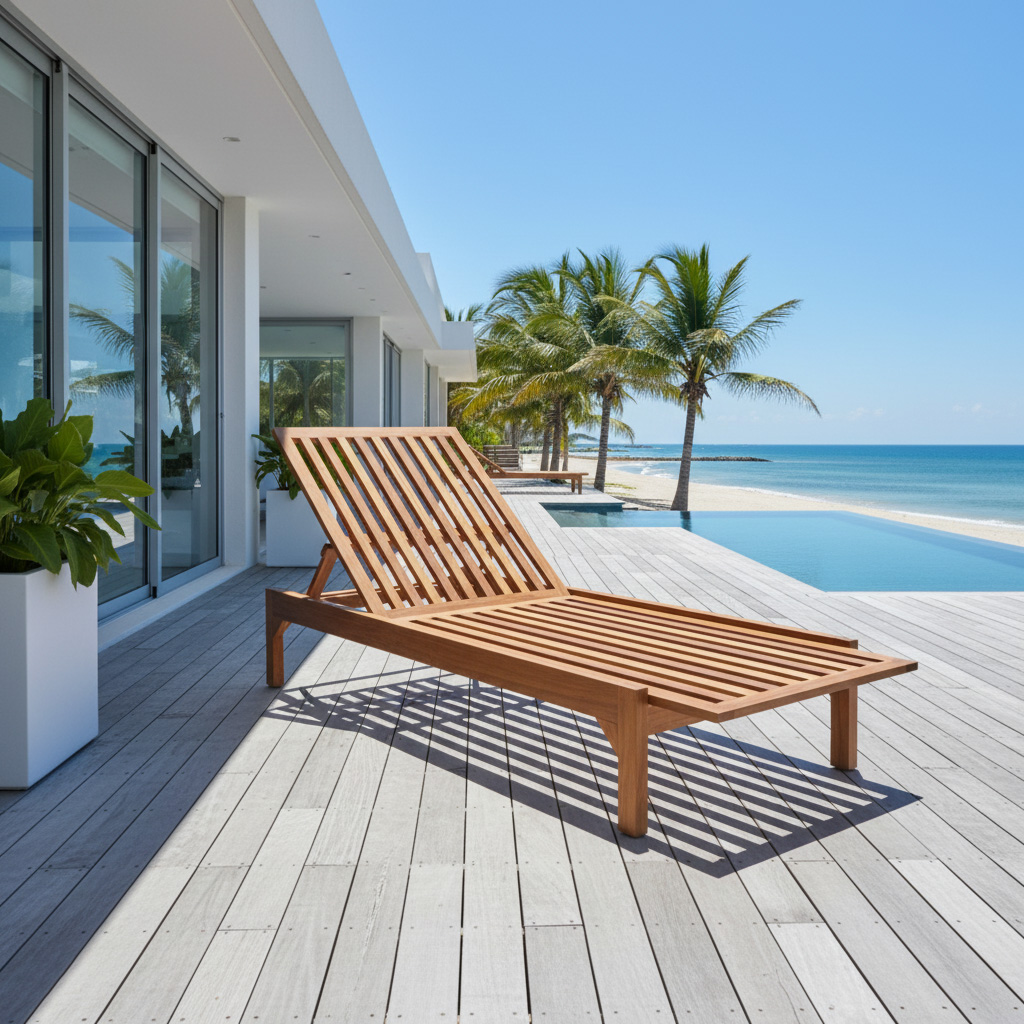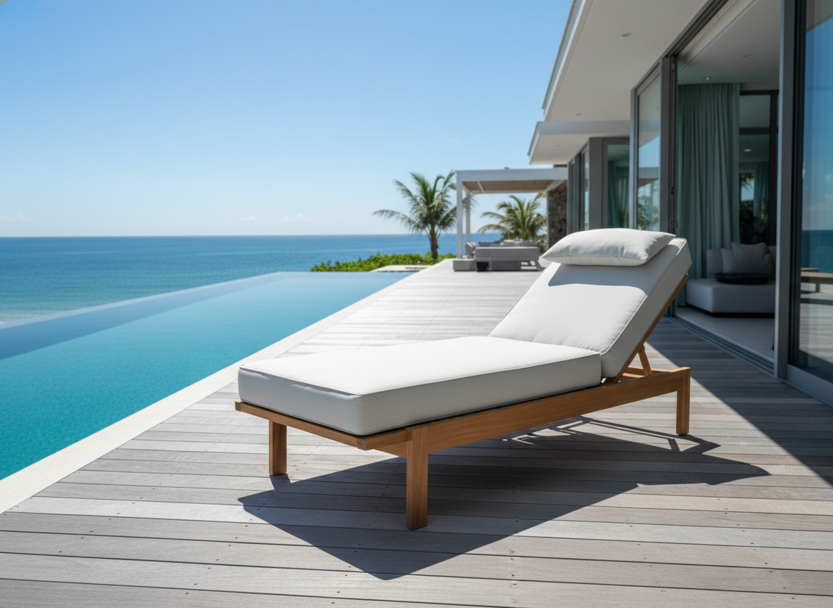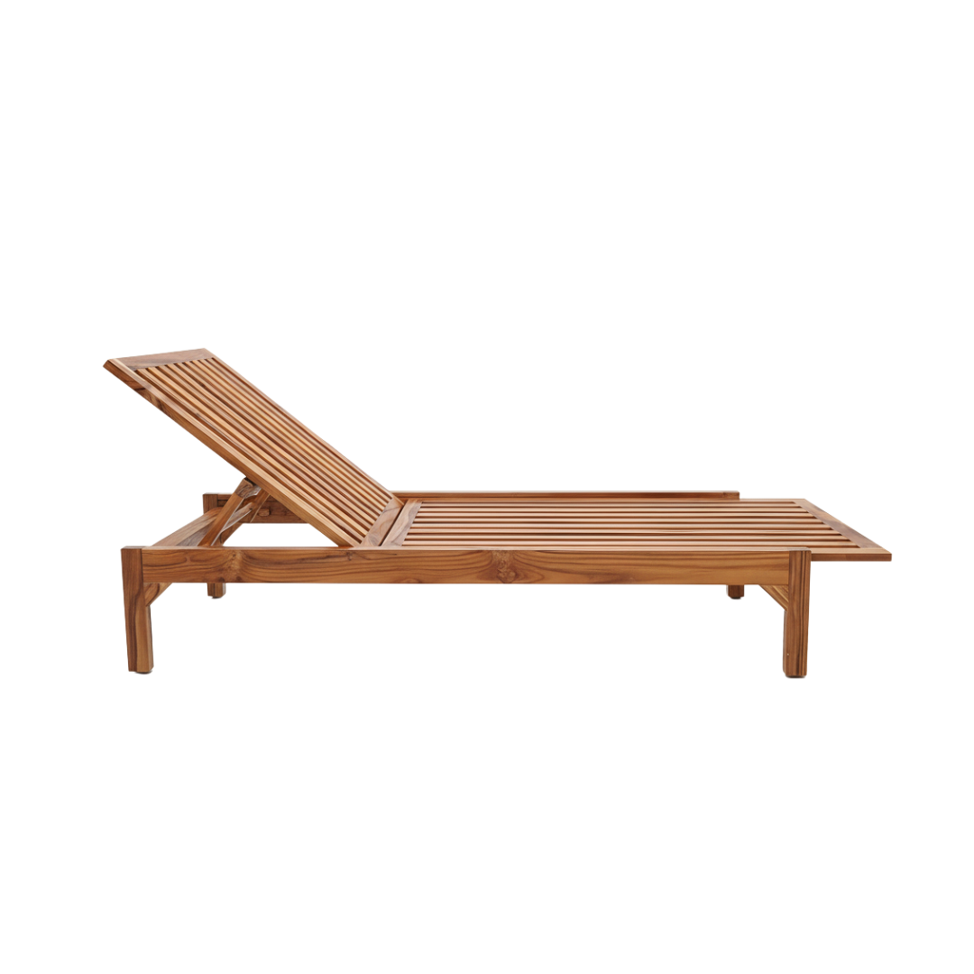 Camastro fabricado con estructura de madera, cojinería fabricada con hule espuma de alta densidad y tela resistente al sol y la intemperie.