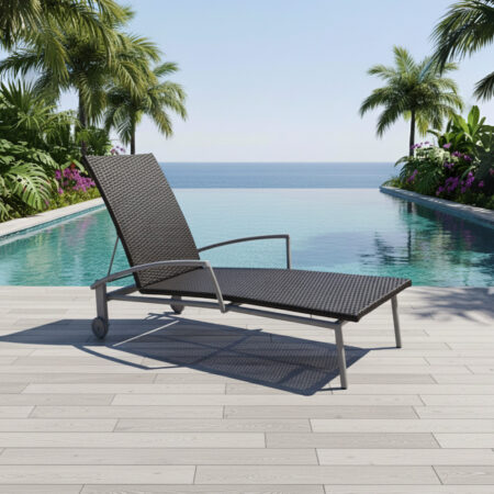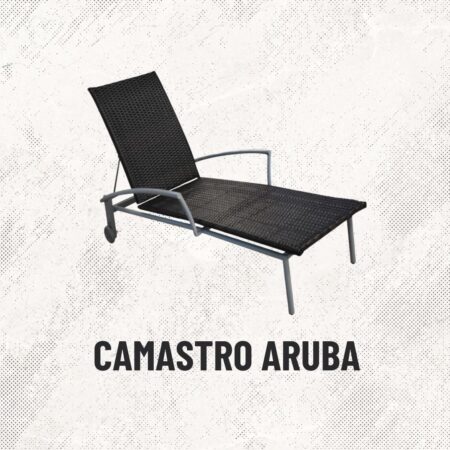 Camastro, fabricado con estructura de aluminio, tejidas con rejilla sintética, cojinería fabricada con hule espuma de alta densidad y tela resistente al sol y la intemperie.