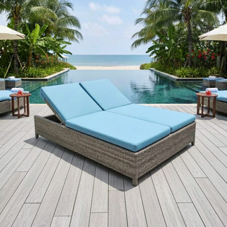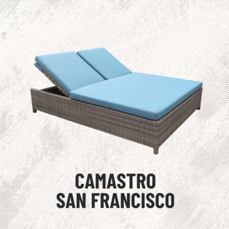 Camastro doble, fabricado con estructura de aluminio, tejido con rejilla sintética, cojinería fabricada con hule espuma de alta densidad y tela resistente al sol y la intemperie.
