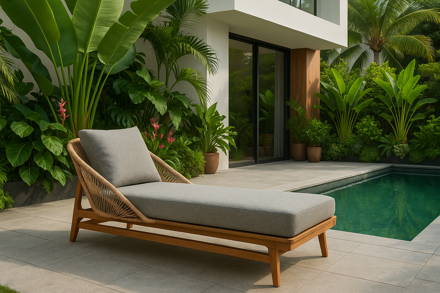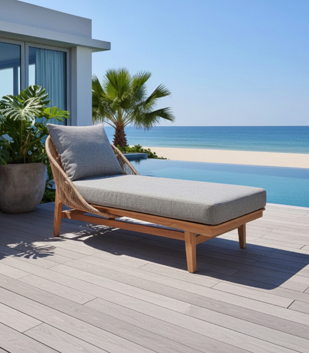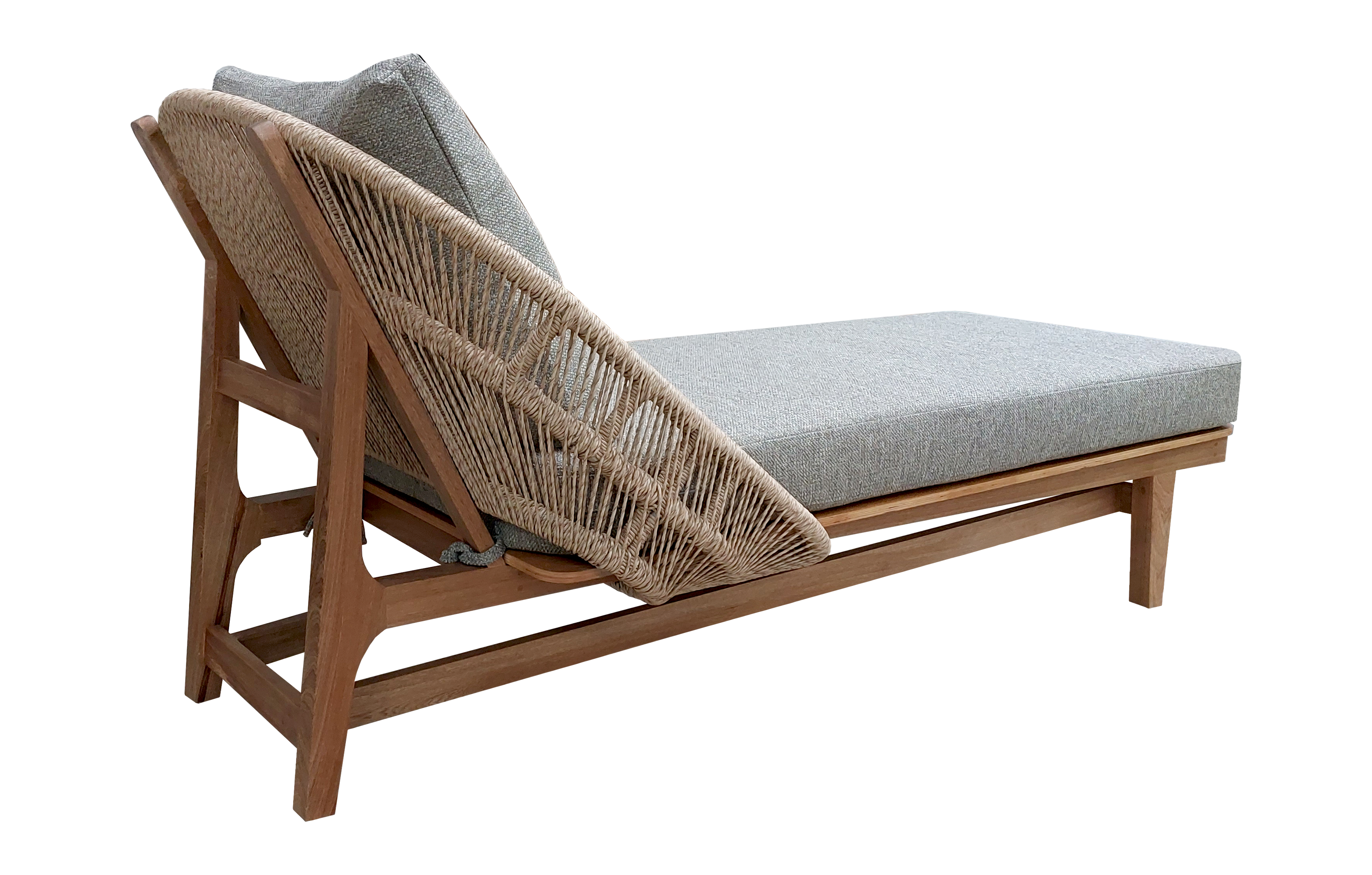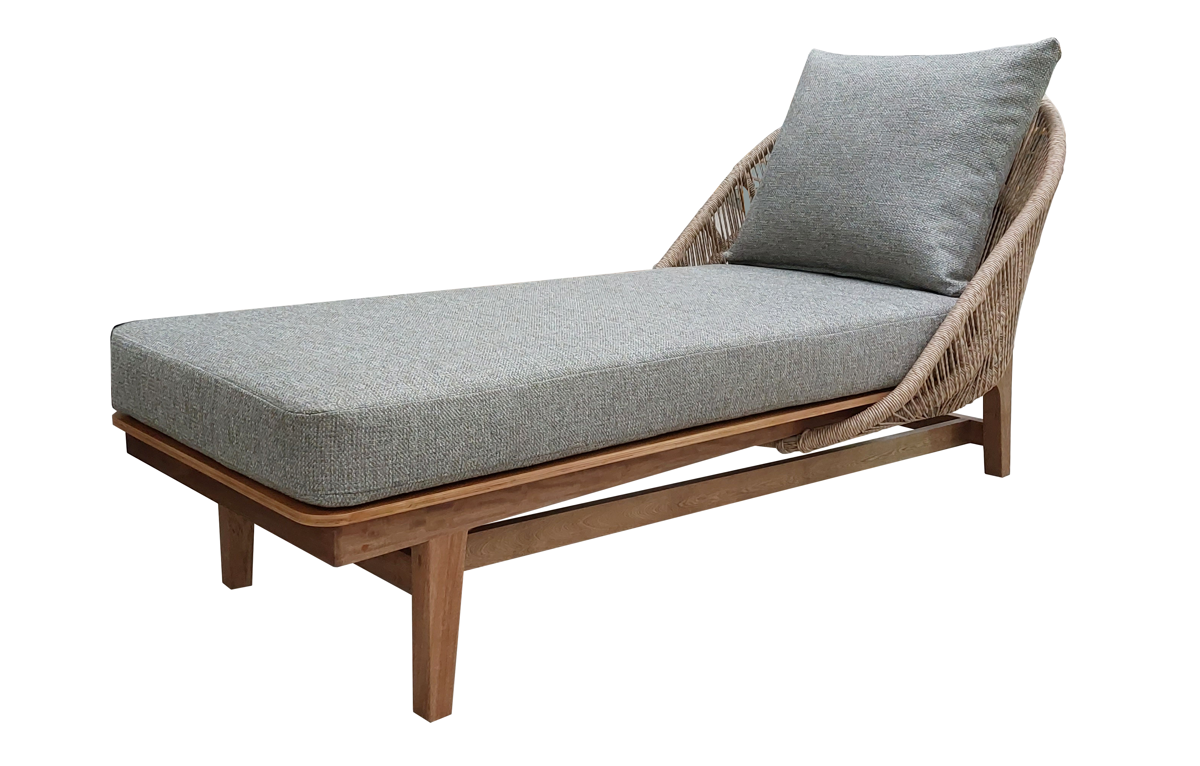 Camastro fabricado con una estructura de madera y aluminio, tejido con rejilla sintética de alta calidad, cojineria en tela sumbrella con espuma de alta densidad.