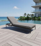 Silla tipo camastro, fabricada con estructura de aluminio, tejidas con rejilla sintética, cojinería fabricada con hule espuma de alta densidad y tela resistente al sol y la intemperie.