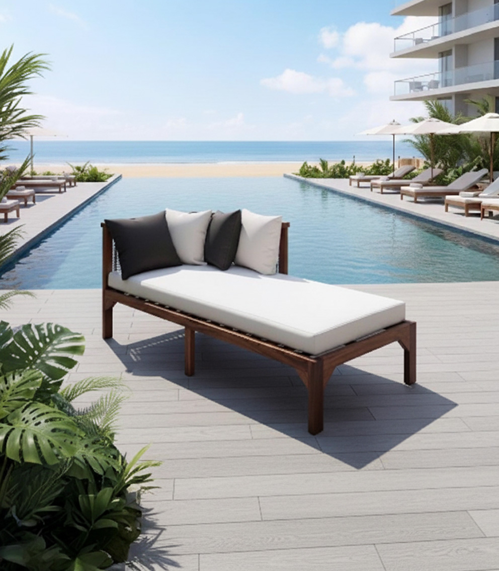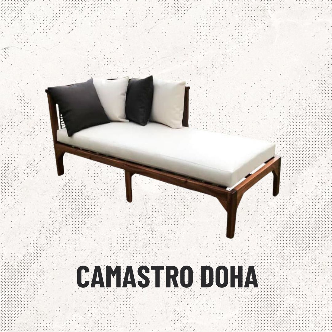 Camastro fabricado con una estructura de madera y aluminio, tejido con rejilla sintética de alta calidad, cojineria en tela sumbrella con espuma de alta densidad.