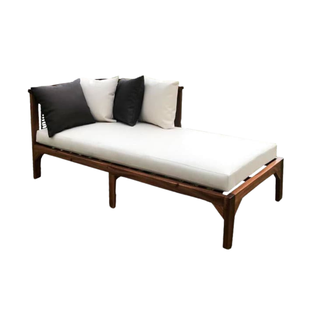 Camastro fabricado con estructura de madera, cojinería fabricada con hule espuma de alta densidad y tela resistente al sol y la intemperie.