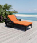 Camastro fabricado con estructura de aluminio, cojinería fabricada con hule espuma de alta densidad y tela resistente al sol y la intemperie.