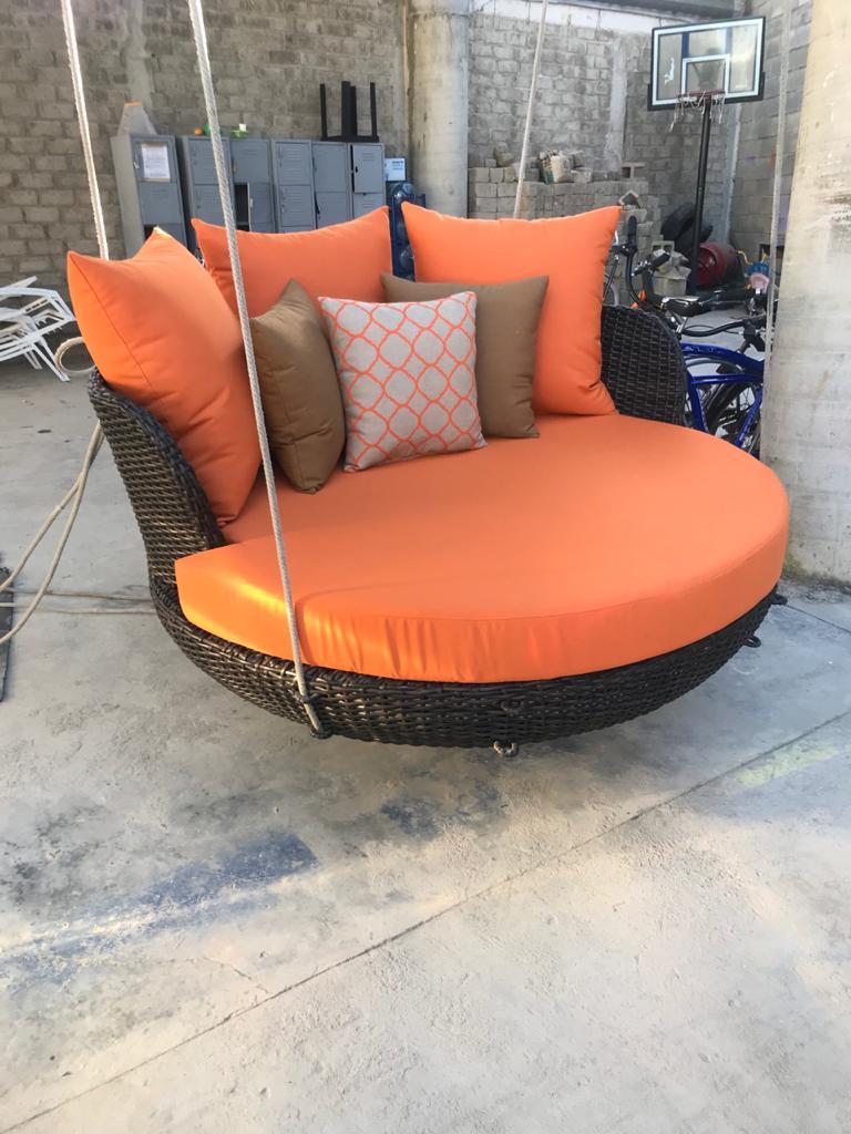 Armazón de aluminio, tejido con hilo, cojines en tela sumbrella, hule espuma de alta densidad.