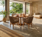 Materiales: Mesa circular de madera y 4 sillas modelo Ankara, tejidas con rejilla sintético de alta calidad, y una cubierta demadera de teca, cojineria fabricada con hule espuma de alta densidad y tela resistente al sol y la intemperie.