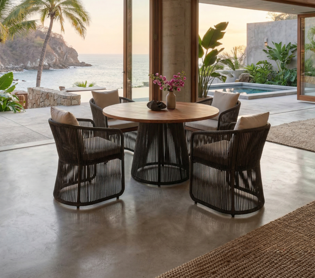 Materiales: Mesa circular de madera y 4 sillas modelo Ankara, tejidas con rejilla sintético de alta calidad, y una cubierta demadera de teca, cojineria fabricada con hule espuma de alta densidad y tela resistente al sol y la intemperie.