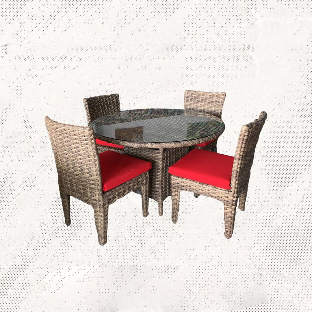 Materiales: Mesa redonda con estructura y cubierta de madera de teca y 4 sillas modelo Calgary, tejidas con rejilla sintético y una base de madera de teca, cojines en tela resistente al sol y la intemperie.