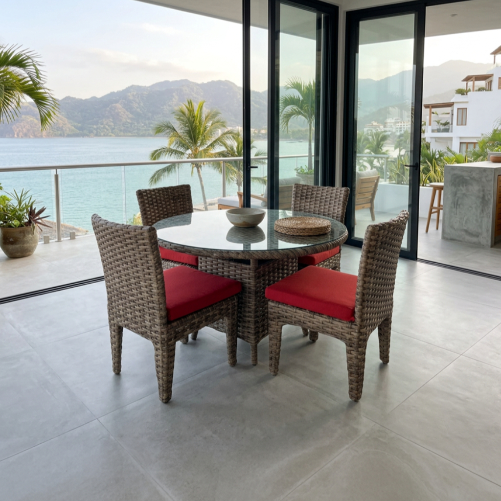 Materiales: Mesa cuadrada con estructura de aluminio tejida con rejilla sintética y una cubierta de cristal templado, 4 sillas modelo Mazatlán tejidas con rejilla sintética, cojineria en tela resistente al sol y la intemperie.