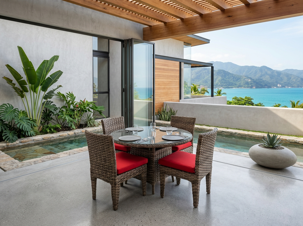 Materiales: Mesa circular con estructura de aluminio tejida con rejilla sintética y una cubierta de cristal templado, 6 sillas modelo Vallarta tejidas con rejilla sintética, cojineria fabricada con espuma de alta densidad, tela resistente al sol y la intemperie.