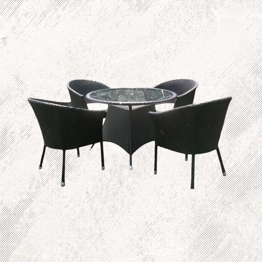 Materiales: Mesa circular con estructura de aluminio tejida con rejilla sintética y una cubierta de cristal templado, 4 sillas modelo Austria tejidas con rejilla sintética, cojineria fabricada con espuma de alta densidad, tela resistente al sol y la intemperie.