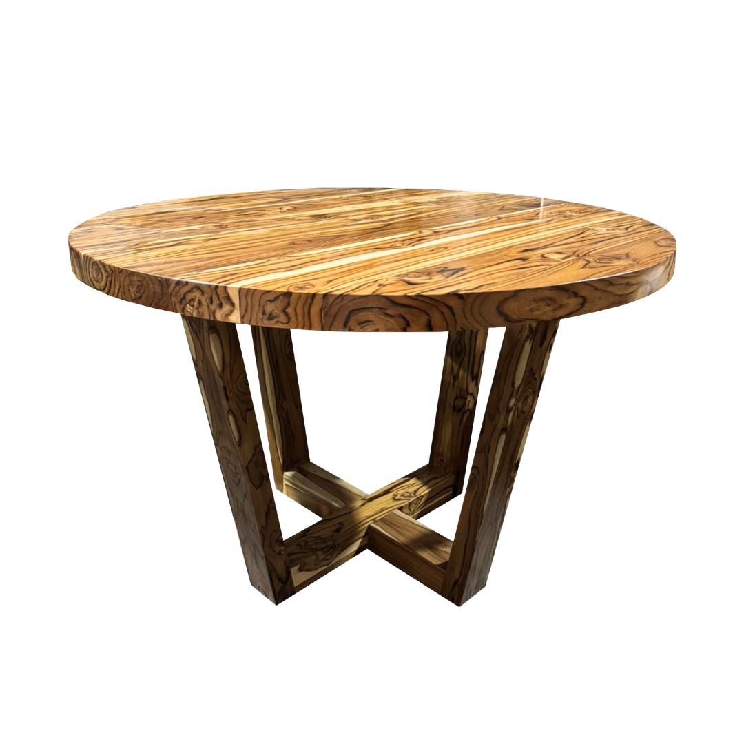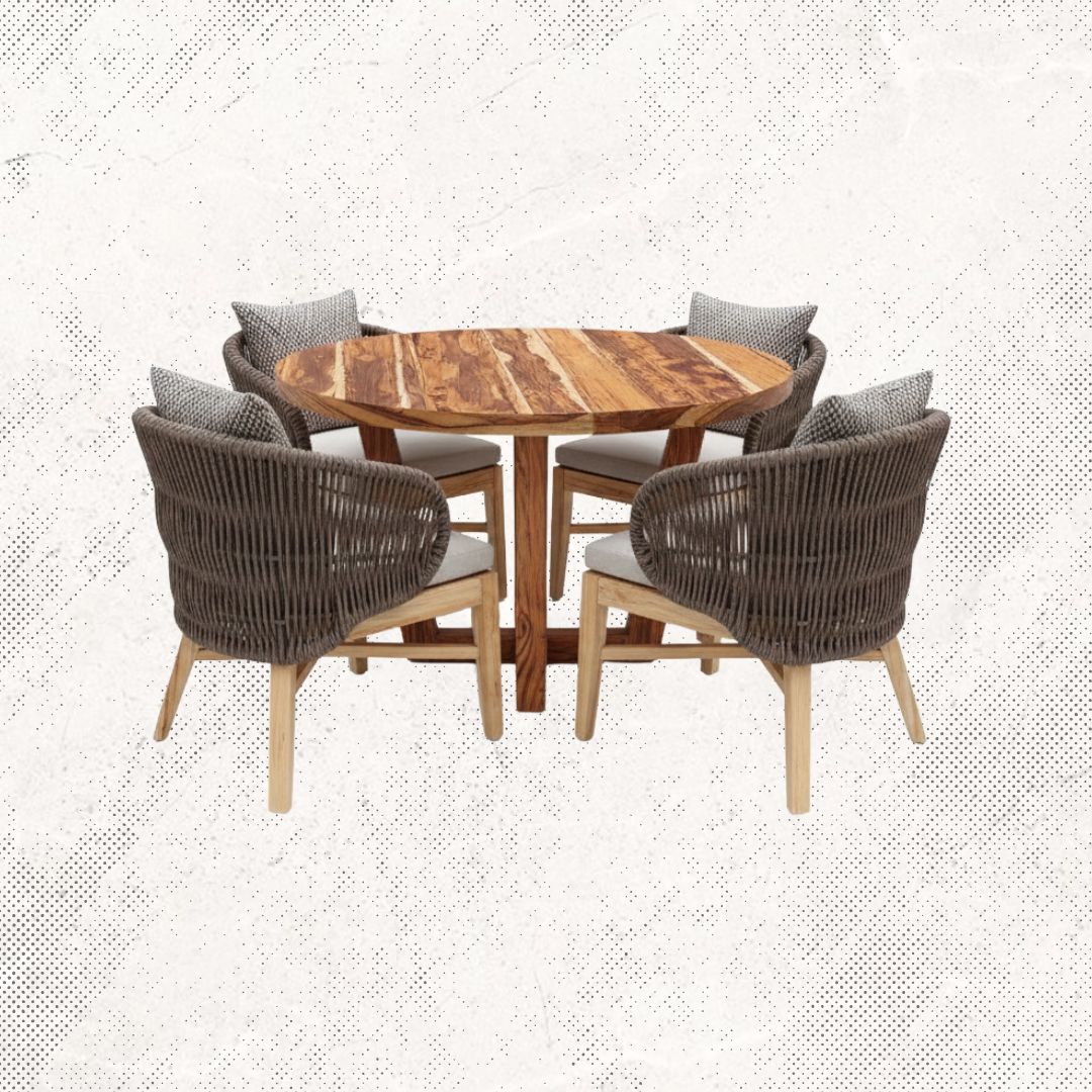 Mesa redonda con cubierta de madera y 4 sillas modelo Victoria, tejidas con rattan sintético, madera de parota, cojines en tela Sumbrella