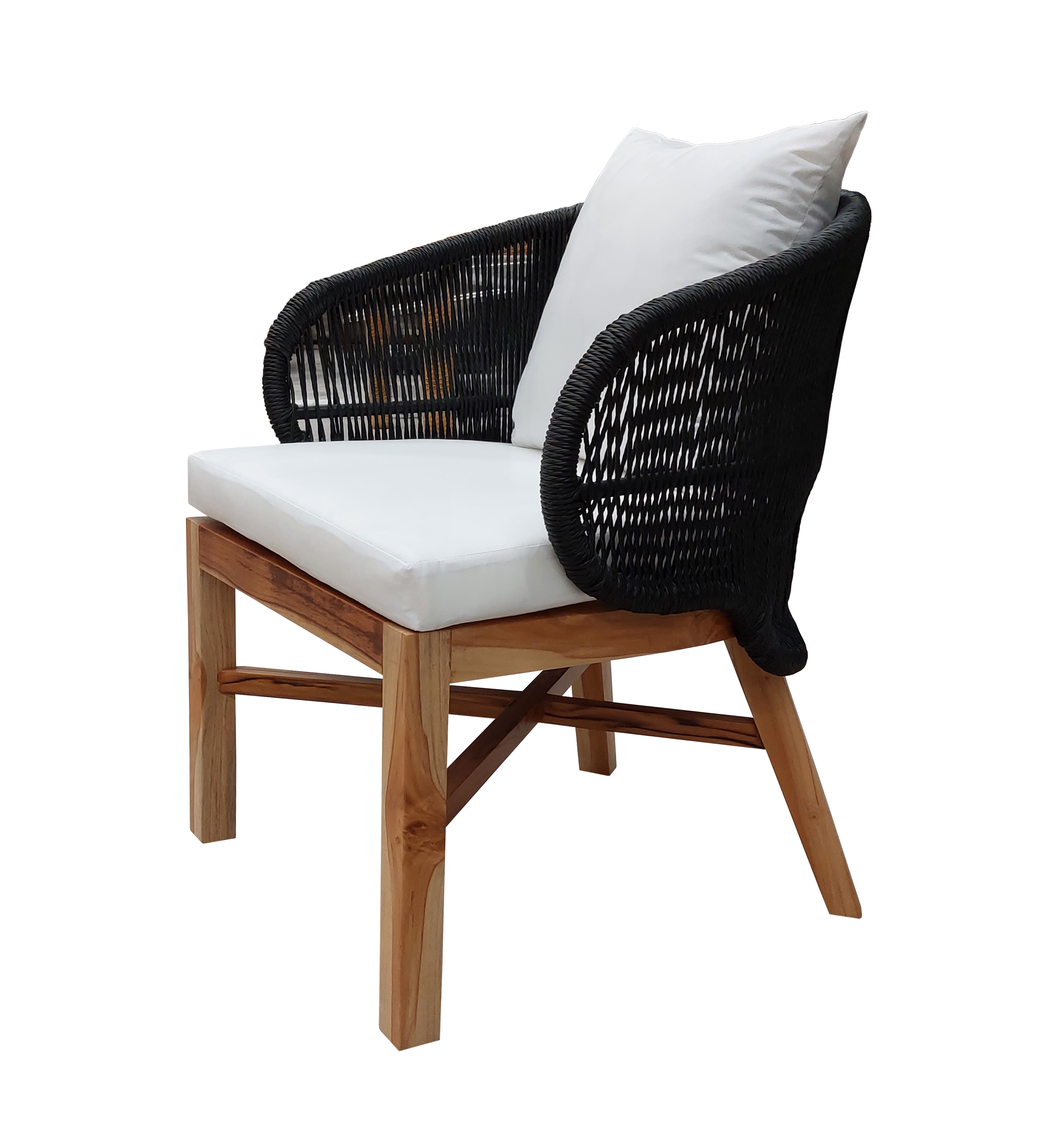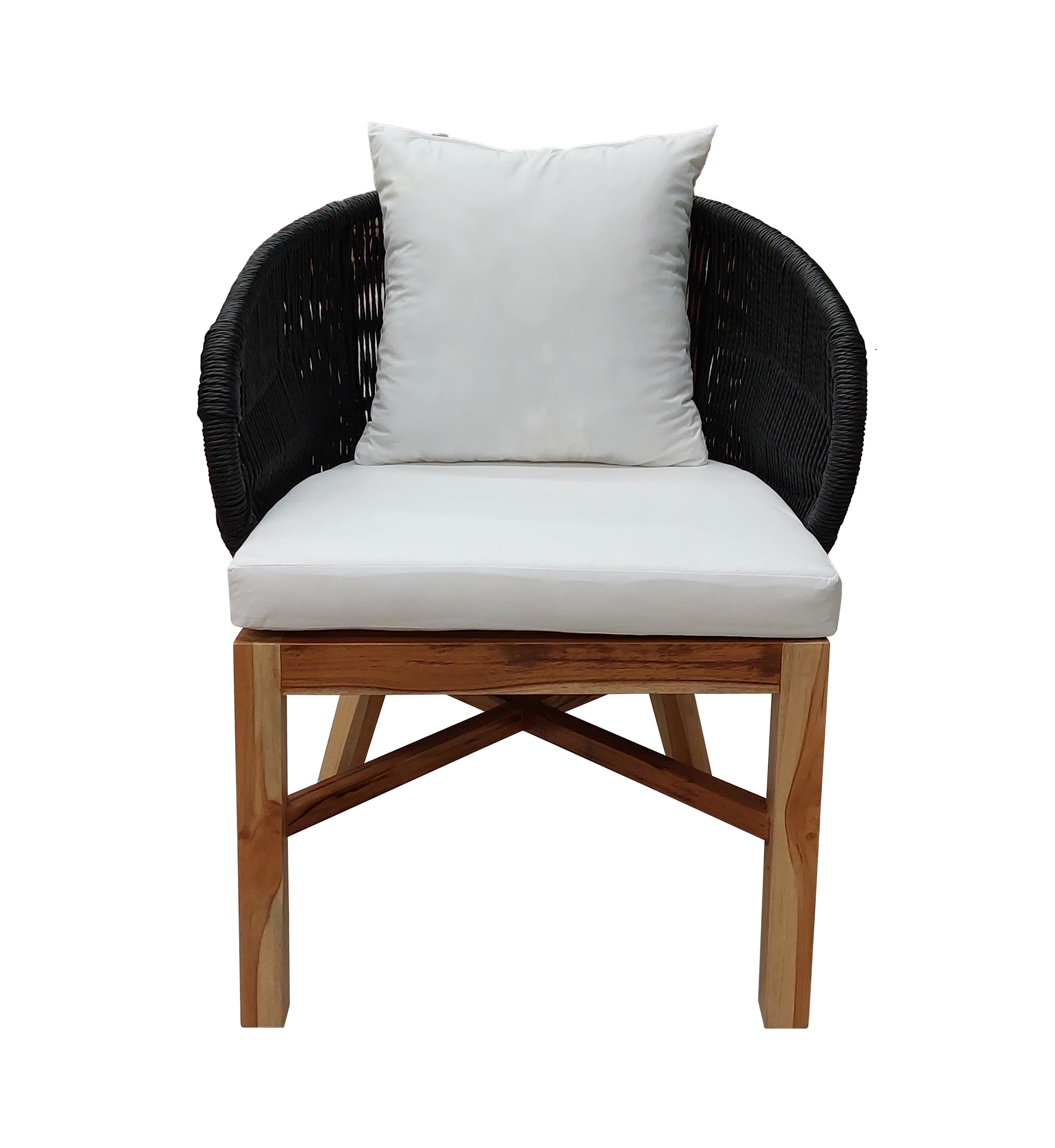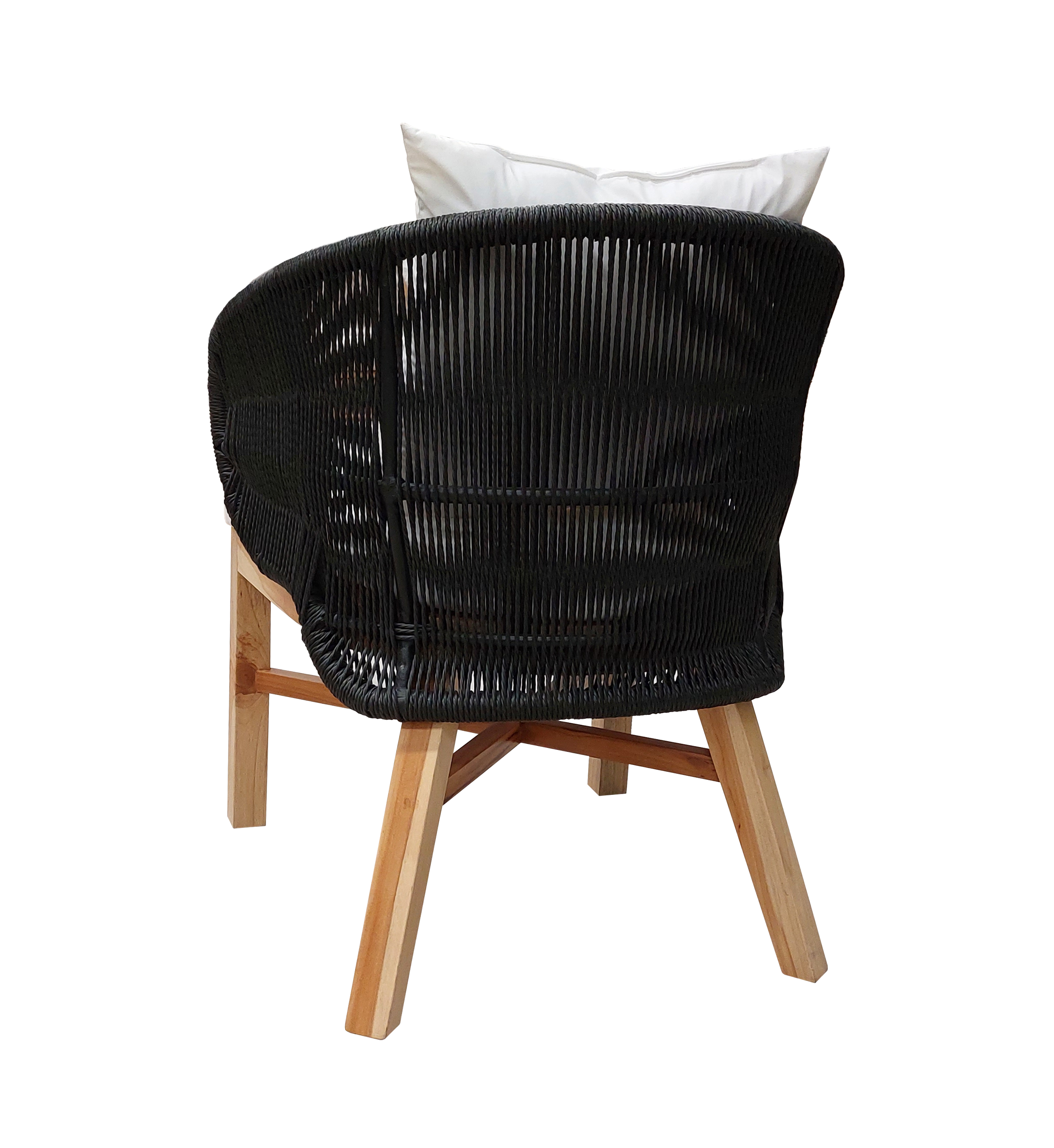 Materiales: Comedor con estructura de madera y detalles tejidos con rejilla sintética de alta calidad, cojinería fabricada con hule espuma de alta densidad y tela resistente al sol y la intemperie.