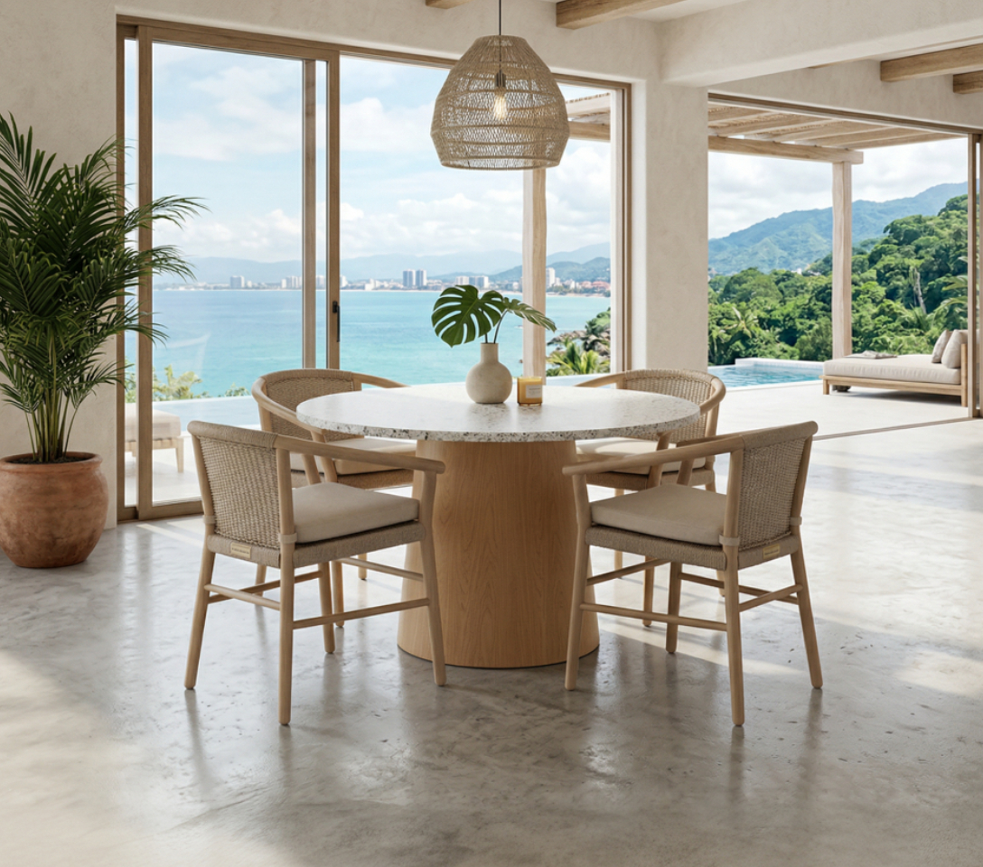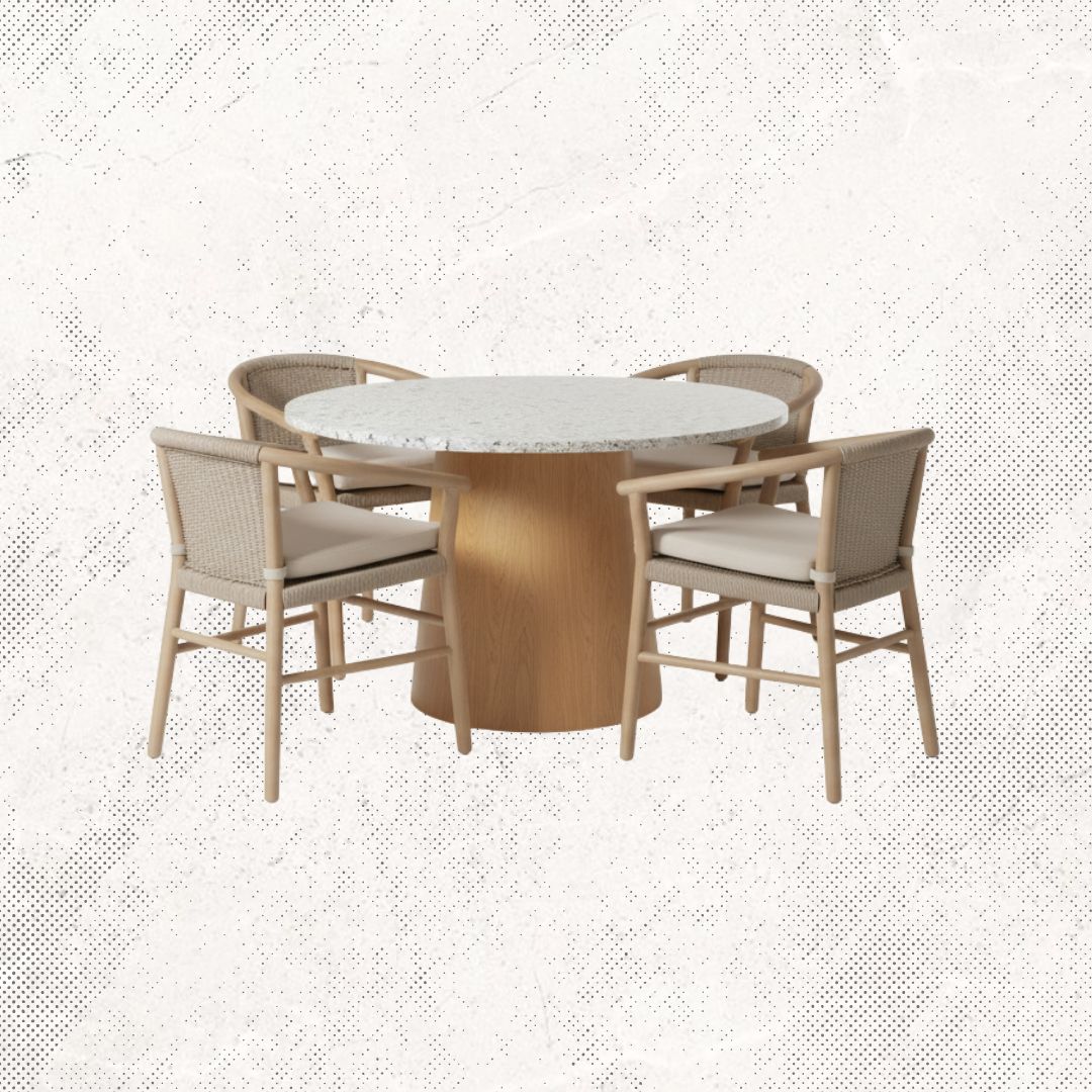 Materiales: Mesa circular modelo Olimpia, con una base en madera Teca con acabado semi-mate y una cubierta de Granito, con 4 sillas de madera modelo Kala.