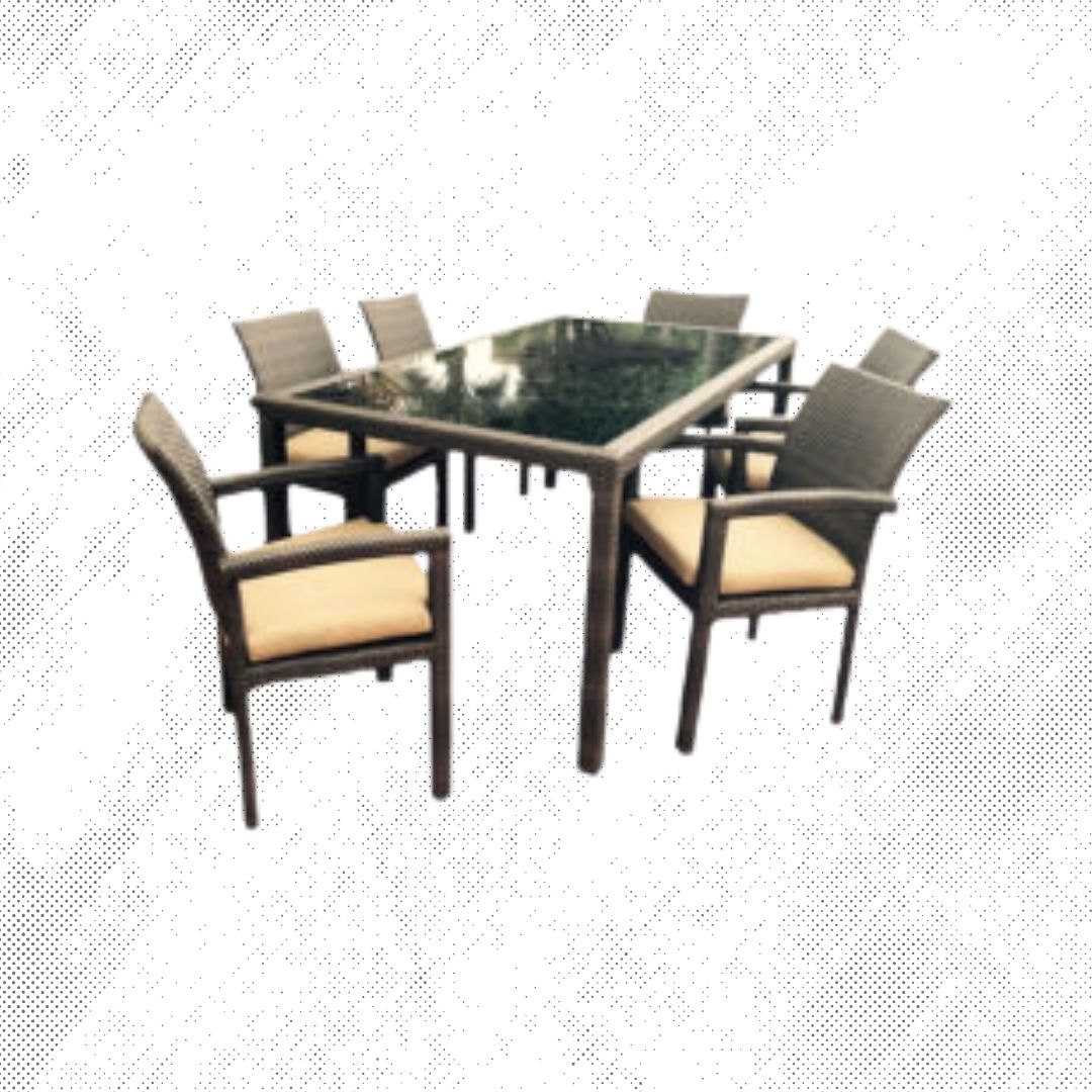Materiales: Mesa rectangular con estructura de aluminio tejida con rejilla sintética y una cubierta de cristal templado, 6 sillas modelo Mazatlán tejidas con rejilla sintética, cojineria en tela resistente al sol y la intemperie.