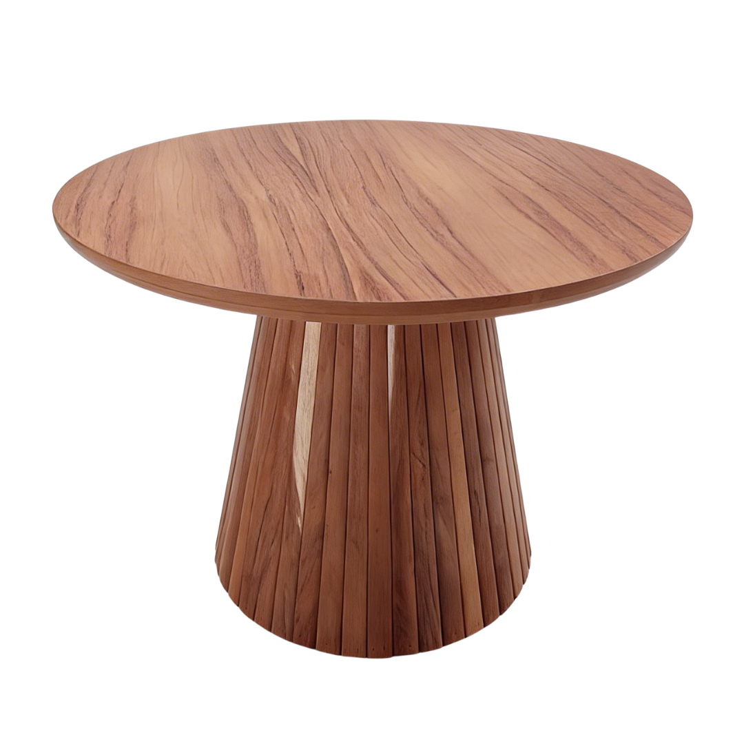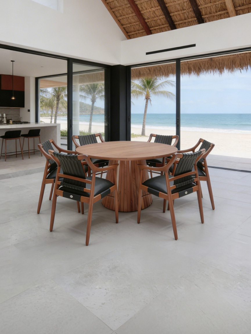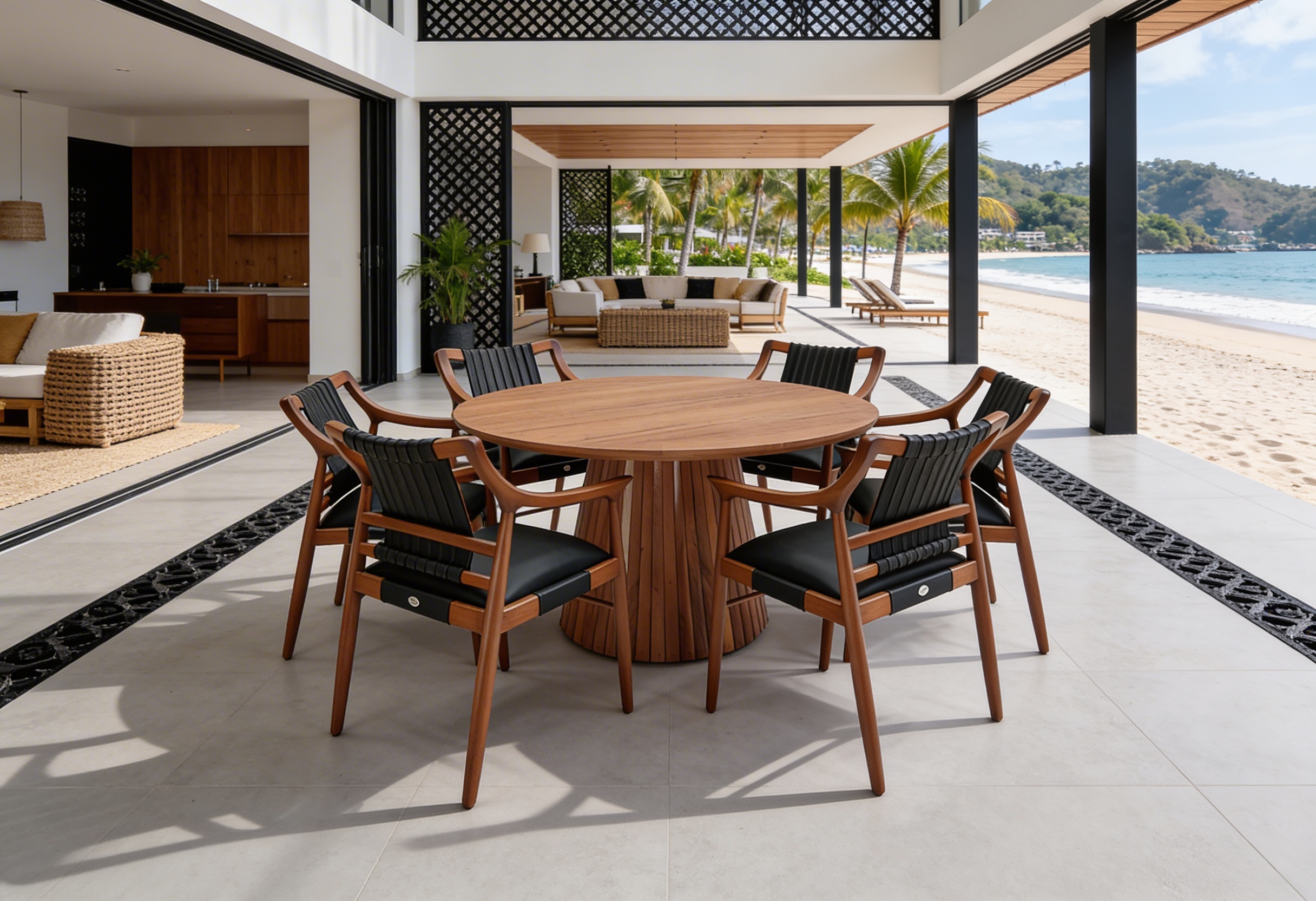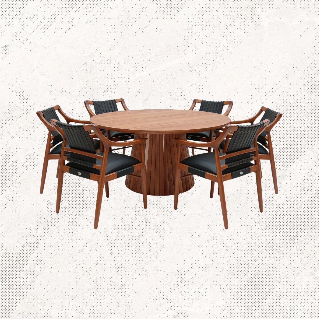 Mesa redonda con cubierta de madera y 4 sillas modelo Victoria, tejidas con rattan sintético, madera de parota, cojines en tela Sumbrella