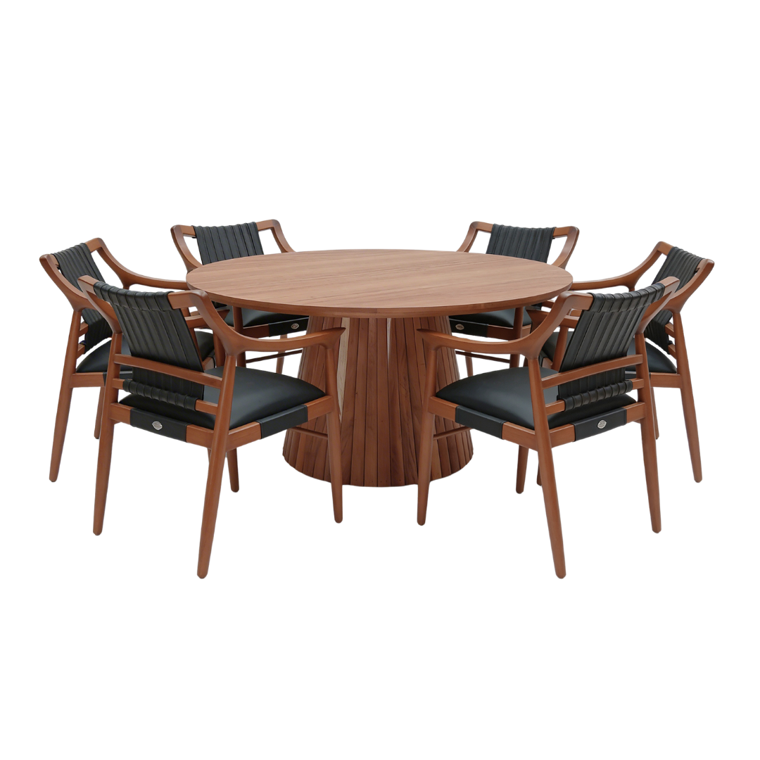 Materiales: Comedor con estructura de aluminio, tejido con rejilla sintética de alta calidad, cojinería fabricada con hule espuma de alta densidad y tela resistente al sol y la intemperie.
