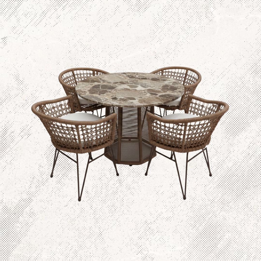 Materiales: Comedor con estructura de aluminio, tejido con rejilla sintética de alta calidad y cubierta de piedra, cojinería fabricada con hule espuma de alta densidad y tela resistente al sol y la intemperie.