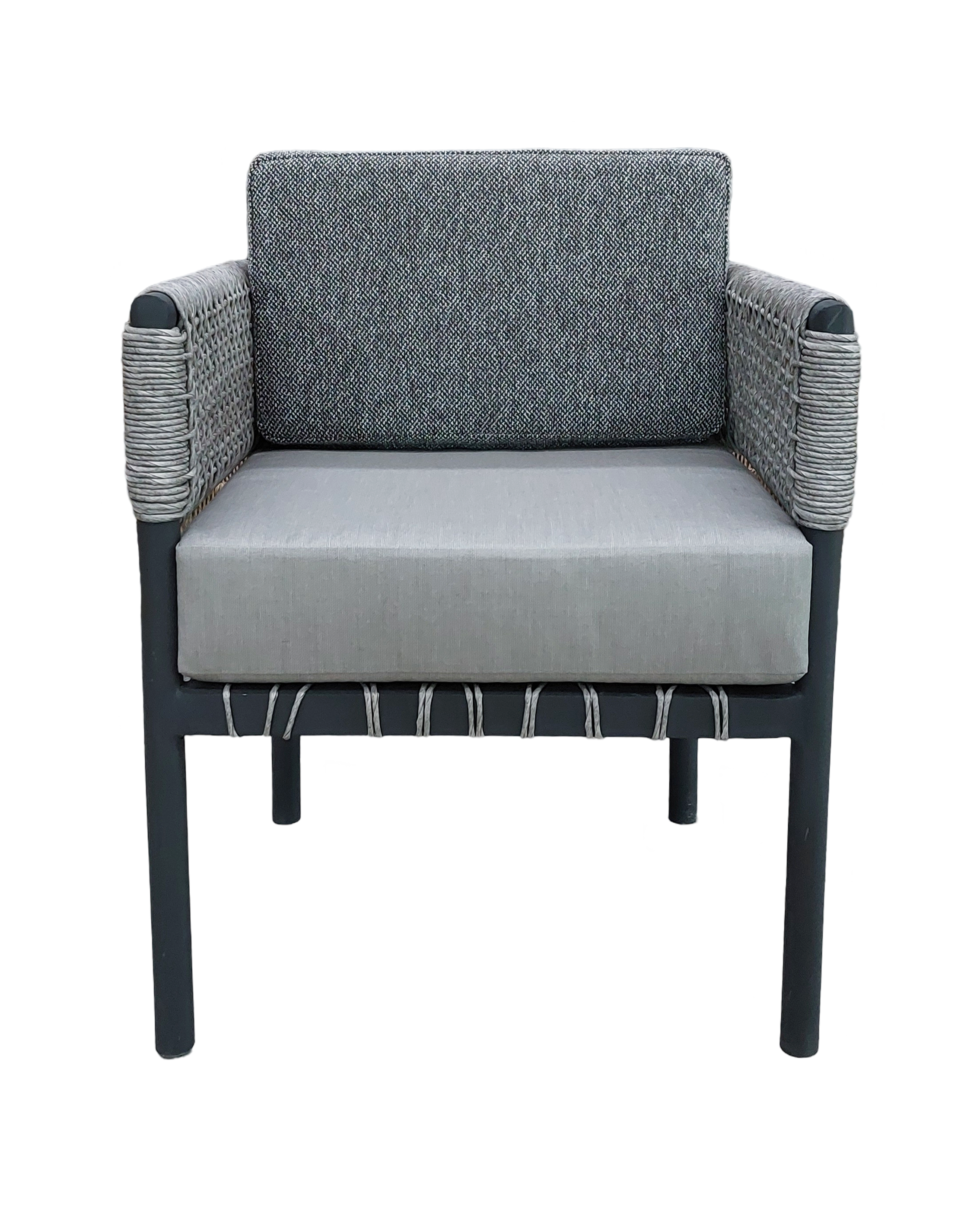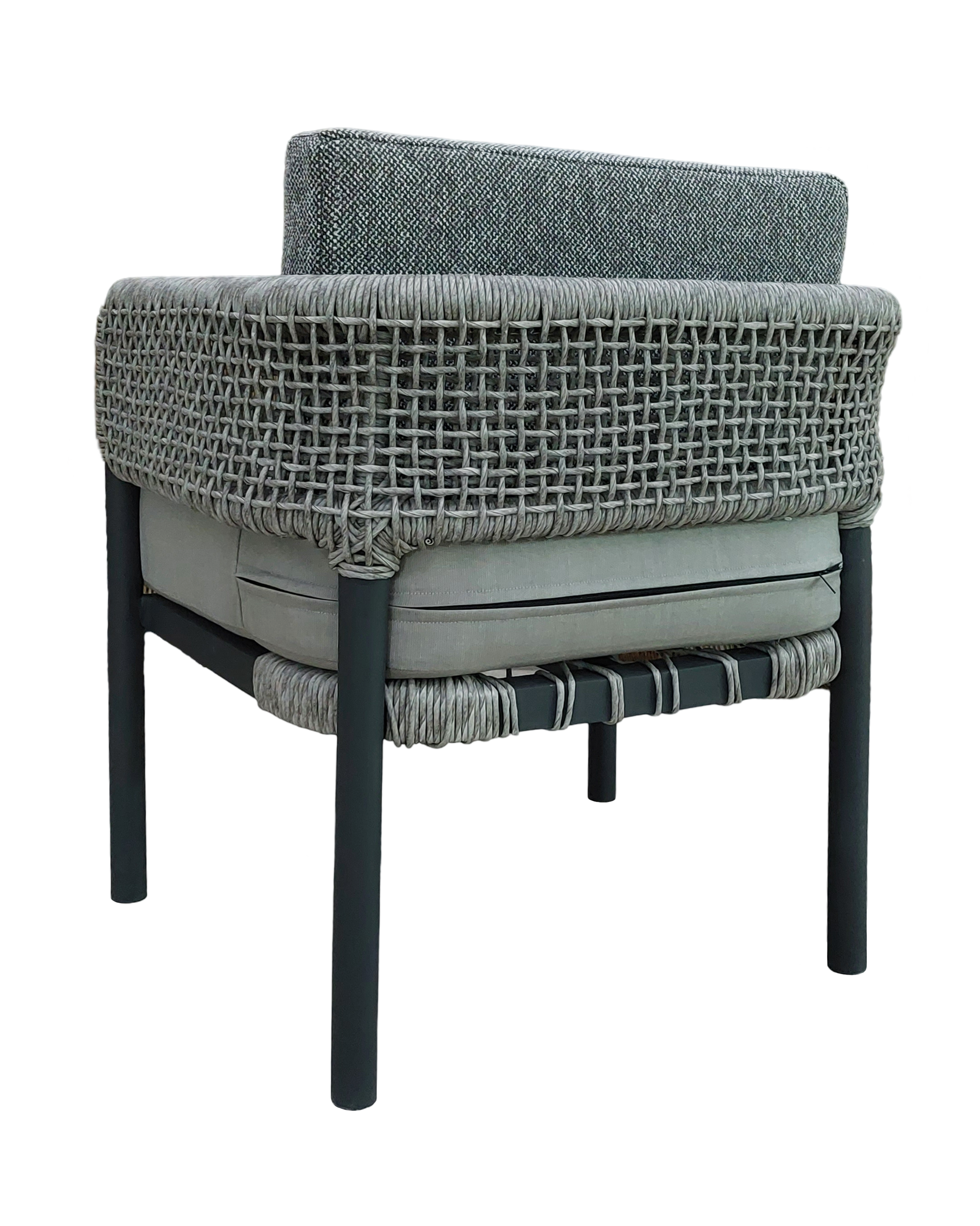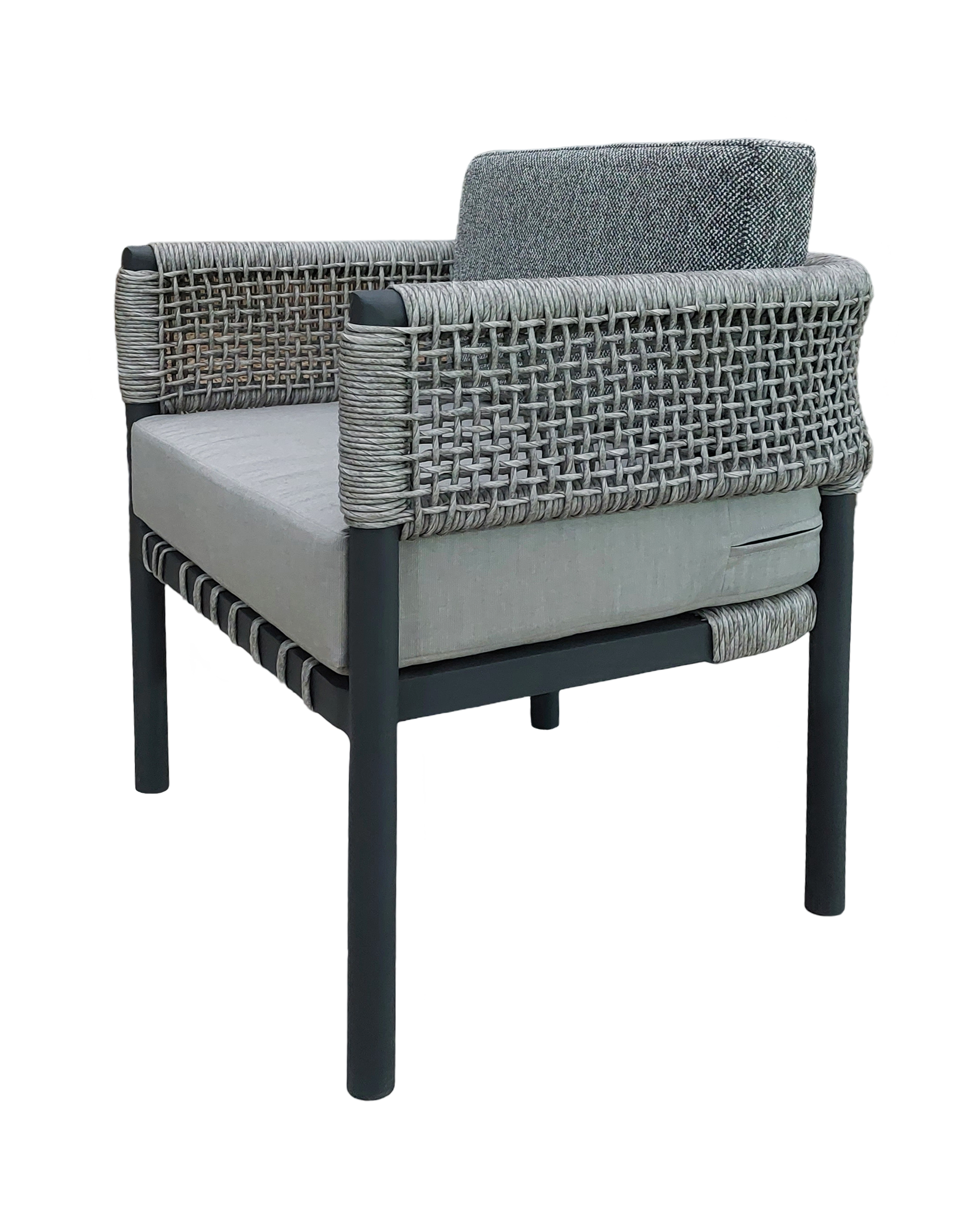 Materiales: Mesa cuadrada con estructura de aluminio tejida con rejilla sintética y una cubierta de cristal templado, 4 sillas modelo Mazatlán tejidas con rejilla sintética, cojineria en tela resistente al sol y la intemperie.