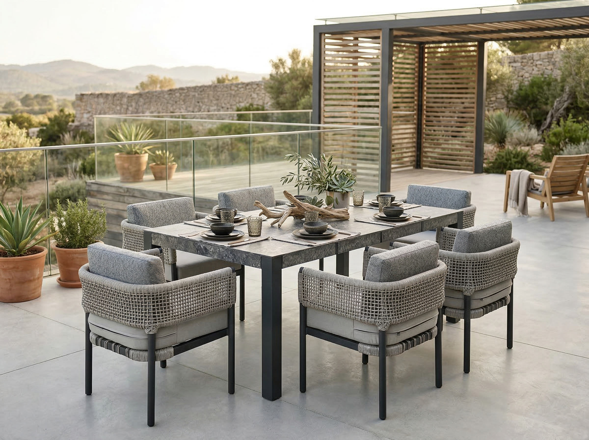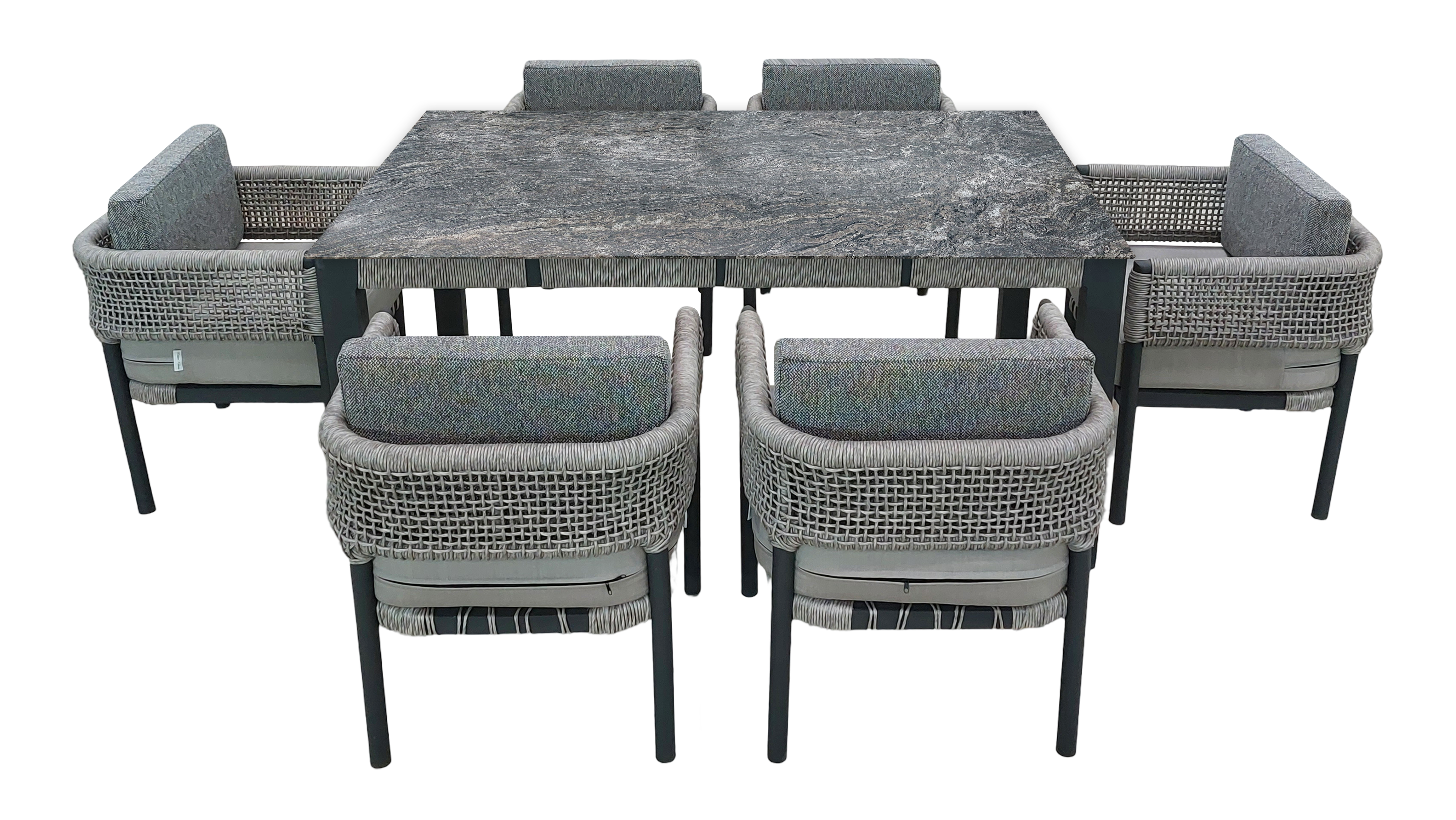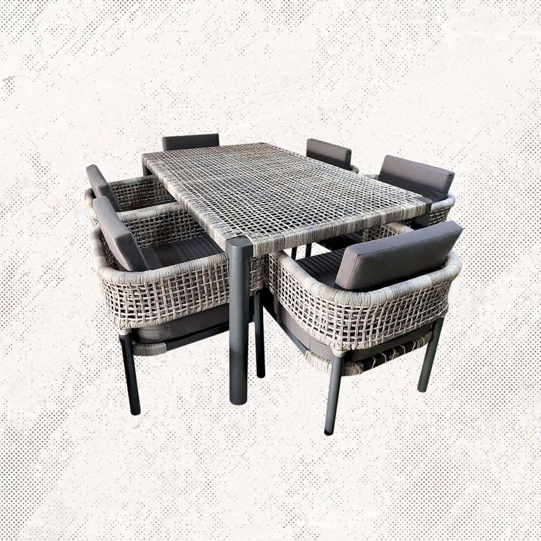Materiales: Mesa rectangular con estructura de aluminio tejida con rejilla sintética y una cubierta de cristal templado, 6 sillas modelo Alicia tejidas con rejilla sintética, cojineria fabricada con espuma de alta densidad, tela resistente al sol y la intemperie.