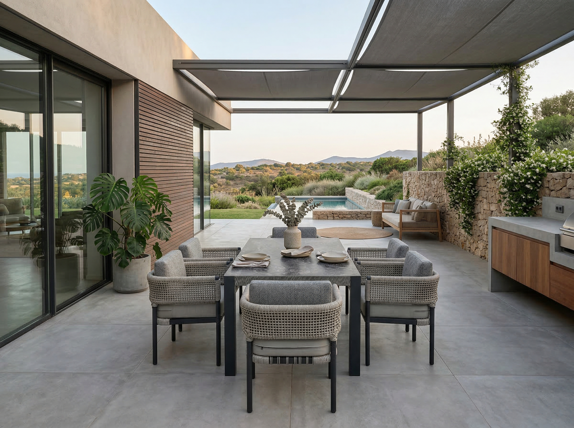 Materiales: Mesa rectangular con estructura de aluminio tejida con rejilla sintética y una cubierta de cristal templado, 4 sillas modelo Westin tejidas con rejilla sintética, cojineria en tela resistente al sol y la intemperie.