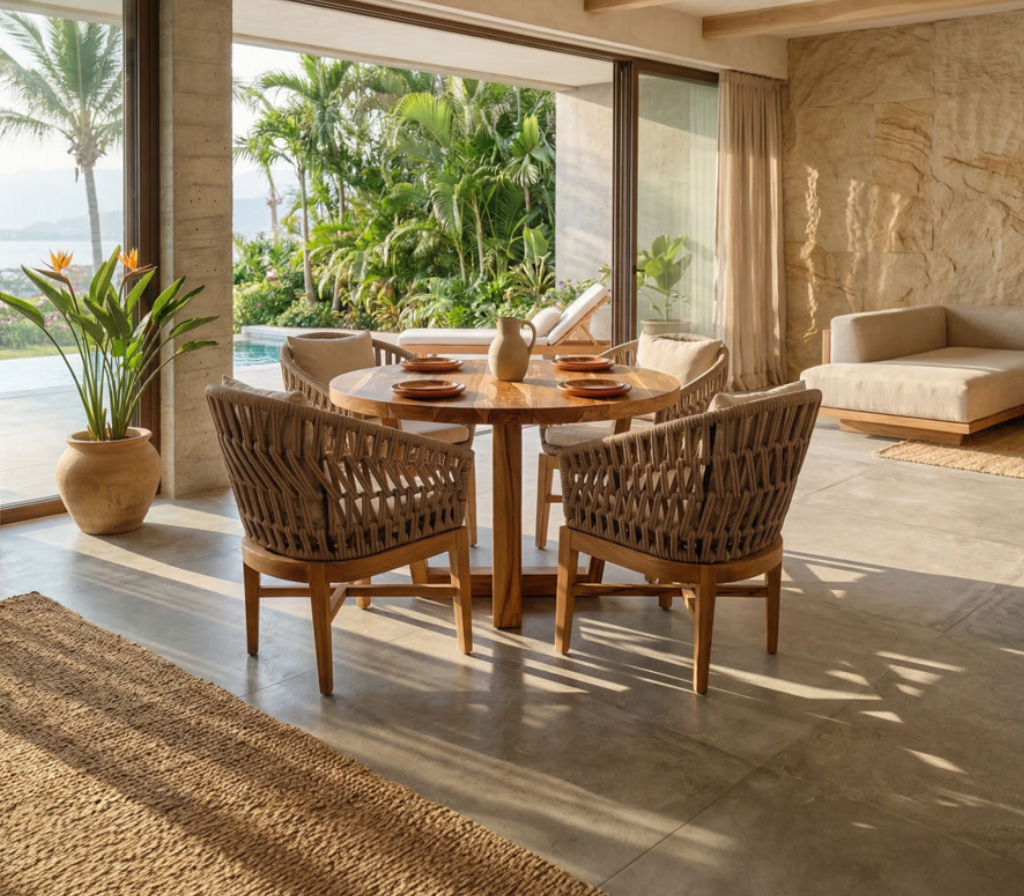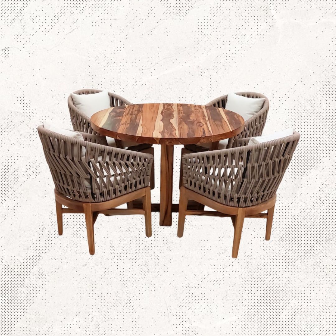 Materiales: Mesa circular de madera de teca y 4 sillas modelo Trente, sillas fabricadas con un respaldo de aluminio tejido con rejilla sintética de alta calidad y una base de madera de teca, cojinería fabricada con hule espuma de alta densidad y tela resistente al sol y la intemperie.