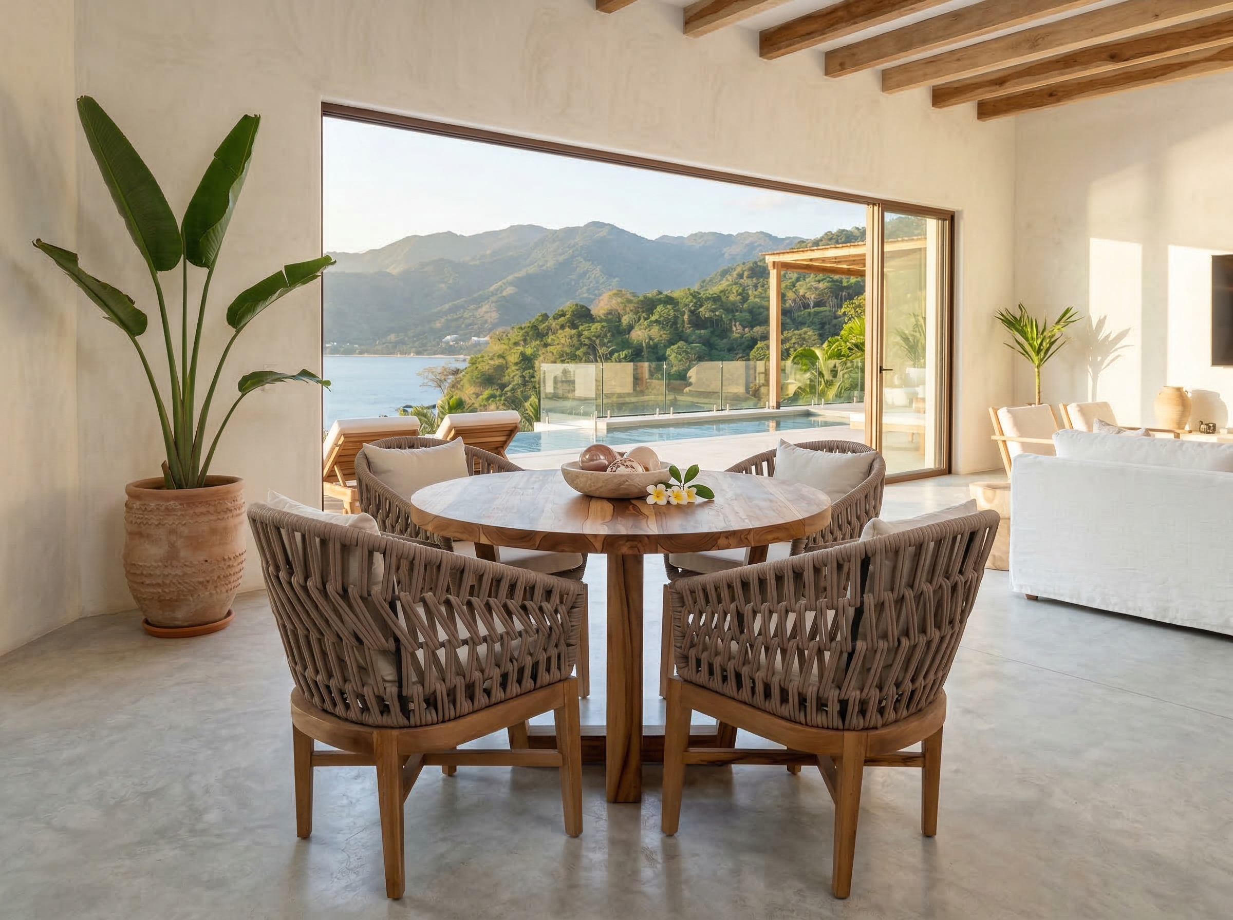Materiales: Mesa circular con estructura de aluminio tejida con rejilla sintética y una cubierta de cristal templado, 6 sillas modelo Vallarta tejidas con rejilla sintética, cojineria fabricada con espuma de alta densidad, tela resistente al sol y la intemperie.