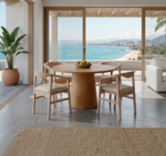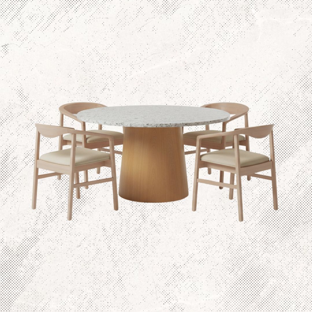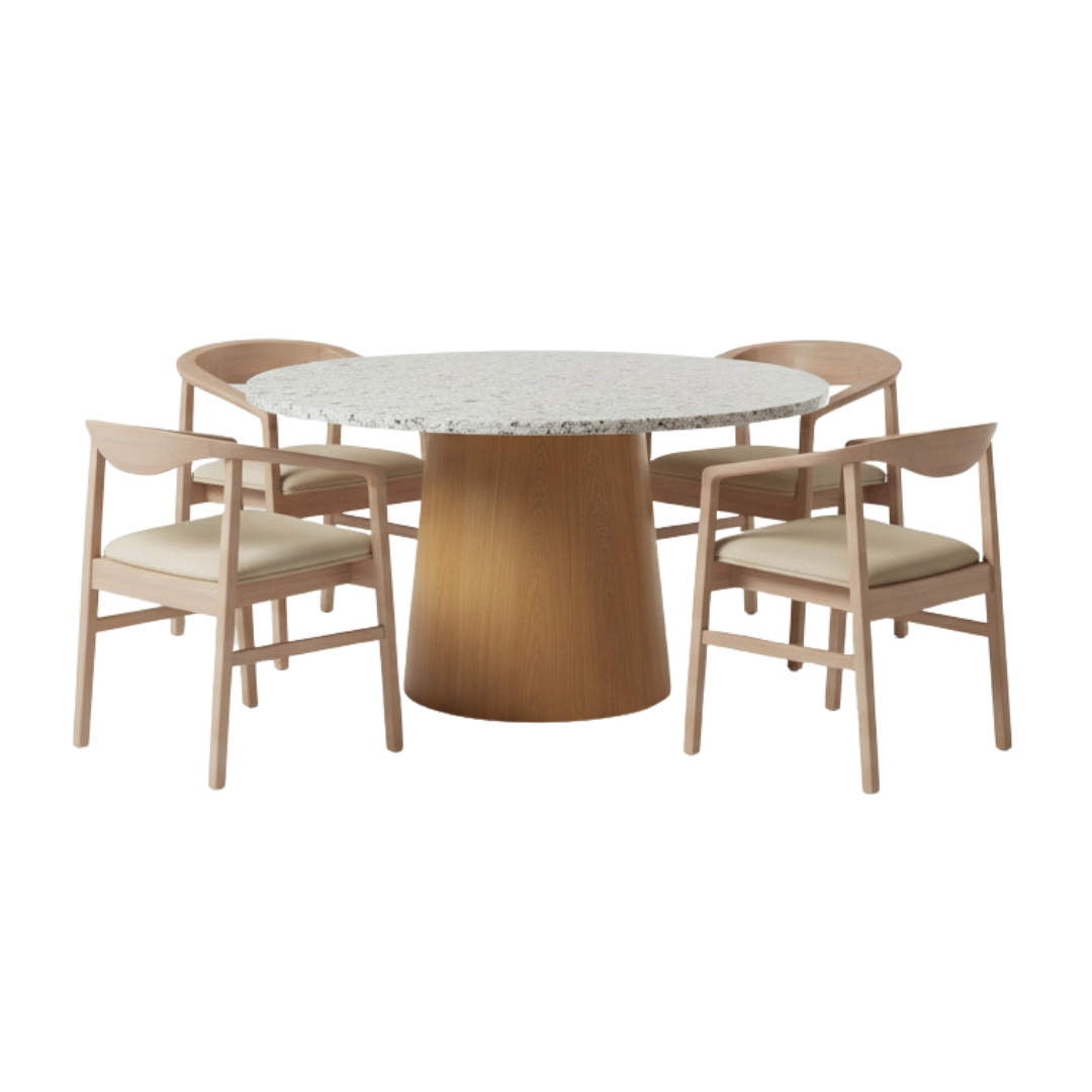 Materiales: Mesa circular modelo Olimpia, con estructura de madera de teca en acabado semi-mate y una cubierta de Granito y 4 sillas de madera teca modelo Turin.