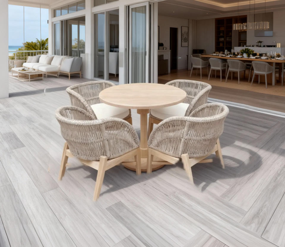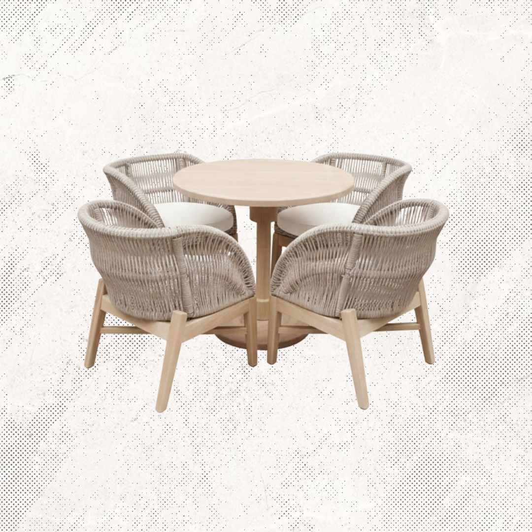 Mesa redonda con cubierta de madera y 4 sillas modelo Calgary tejidas con rattan sintético y madera de parota, cojines en tela resistente al sol y la intemperie.