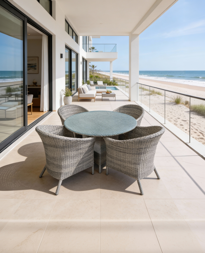 Materiales: Comedor con estructura de aluminio, tejido con rejilla sintética de alta calidad, cojinería fabricada con hule espuma de alta densidad y tela resistente al sol y la intemperie.