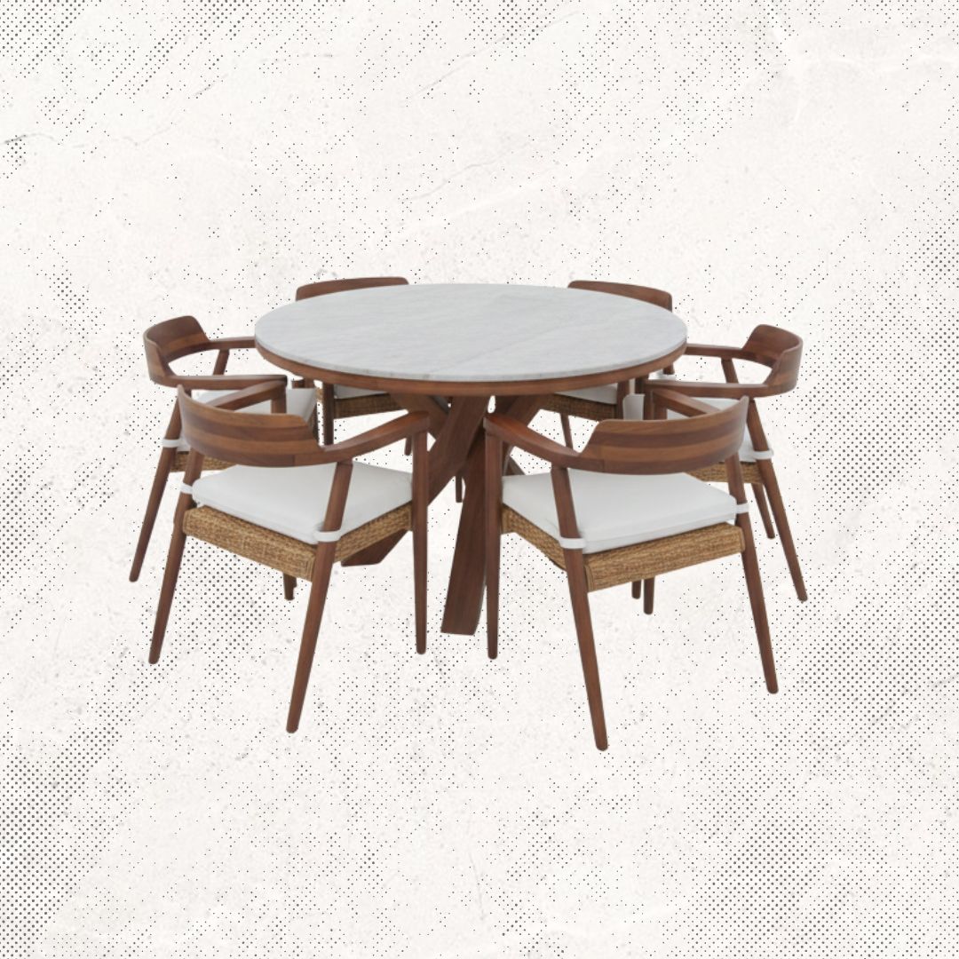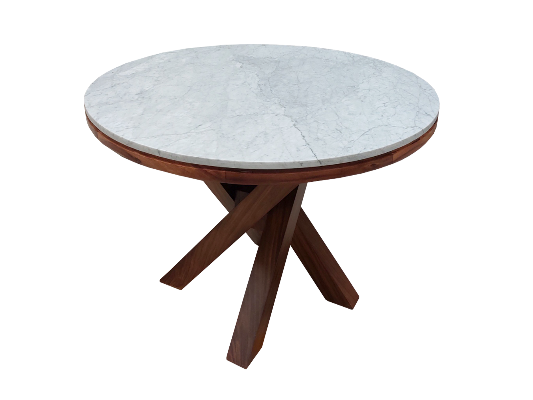 Mesa redonda con cubierta de marmol negro y 4 sillas modelo Montreal tejidas con rattan sintético y madera de parota, cojines en tela Sumbrella