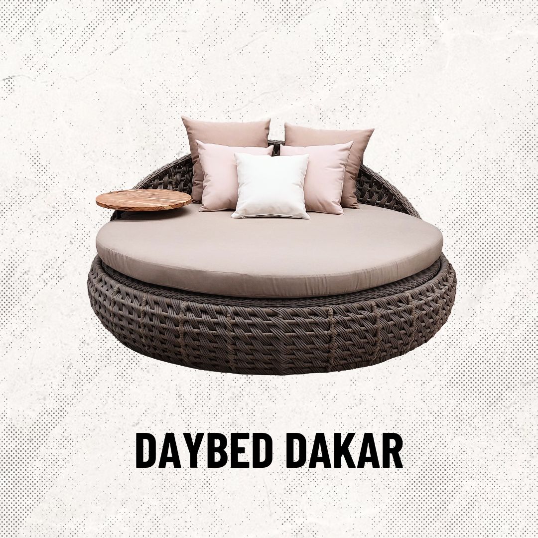 Materiales: Armazón de aluminio, tejido con rejilla sintética, cojín hule espuma de alta densidad, funda interna, funda externa en tela resistente al sol y la intemperie con cierres reforzados.
