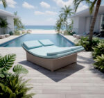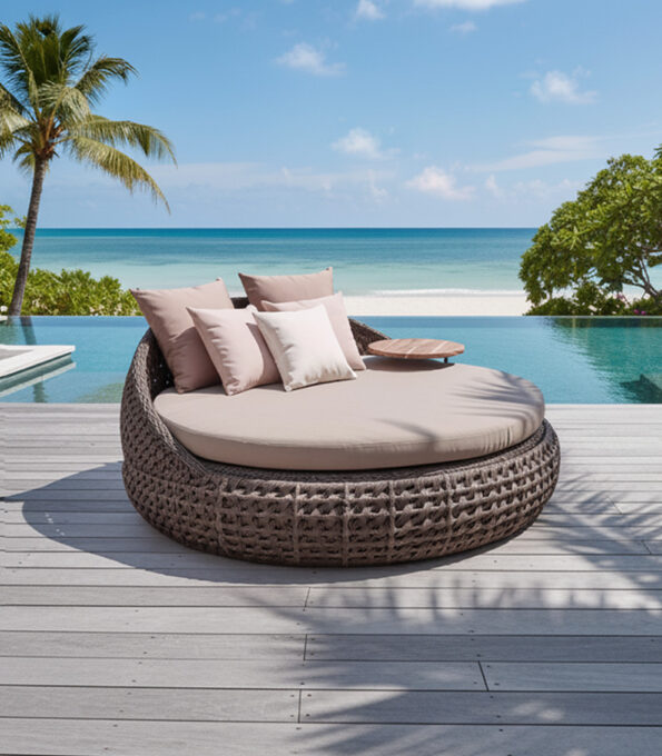 Materiales: Estructura de Aluminio reforzado, cojín hule espuma de alta densidad, funda interna, funda externa en tela resistente al sol y la intemperie con cierres reforzados.
