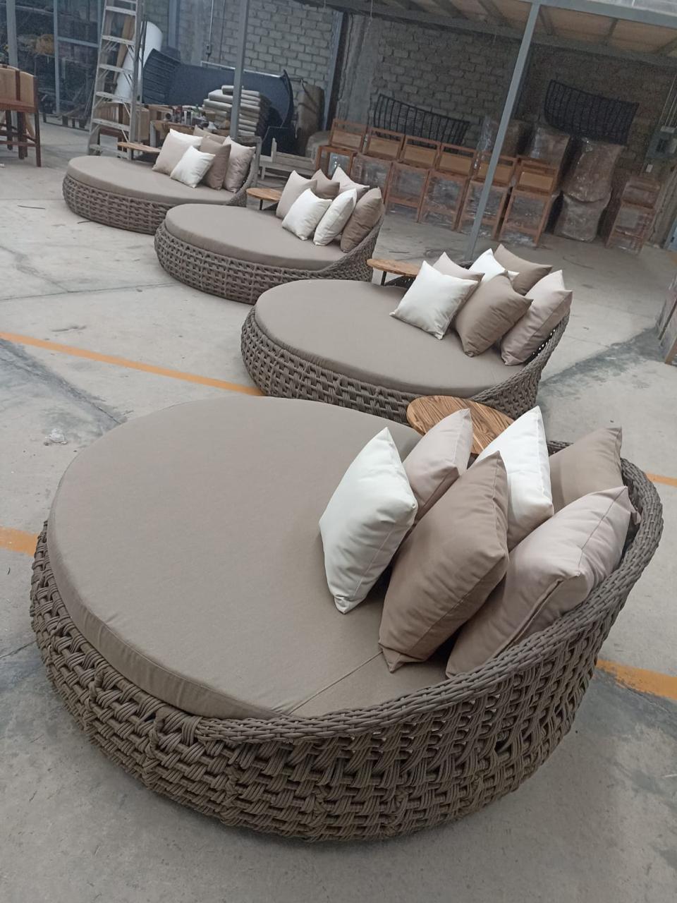 Estructura de aluminio con una base de madera, tejido con rejilla sintética de alta calidad, cojineria en tela sumbrella con hule espuma de alta densidad.