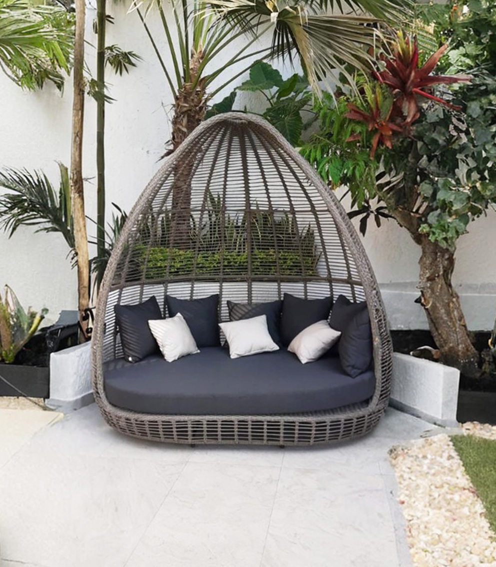 Materiales: Estructura en madera, tejido con rejilla sintética, cojín hule espuma de alta densidad, funda interna, funda externa en tela resistente al sol y la intemperie con cierres reforzados.