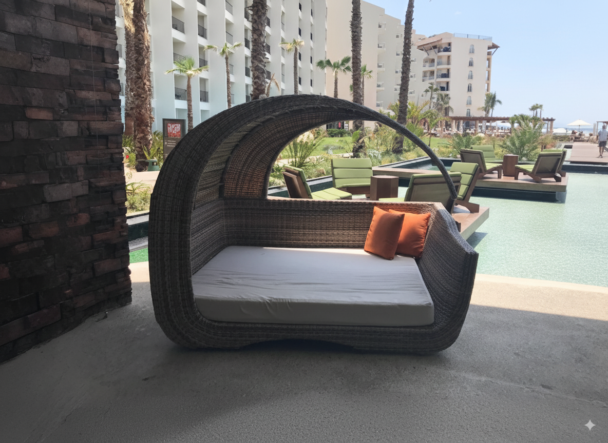 Materiales: Estructura en madera, tejido con rejilla sintética, cojín hule espuma de alta densidad, funda interna, funda externa en tela resistente al sol y la intemperie con cierres reforzados.