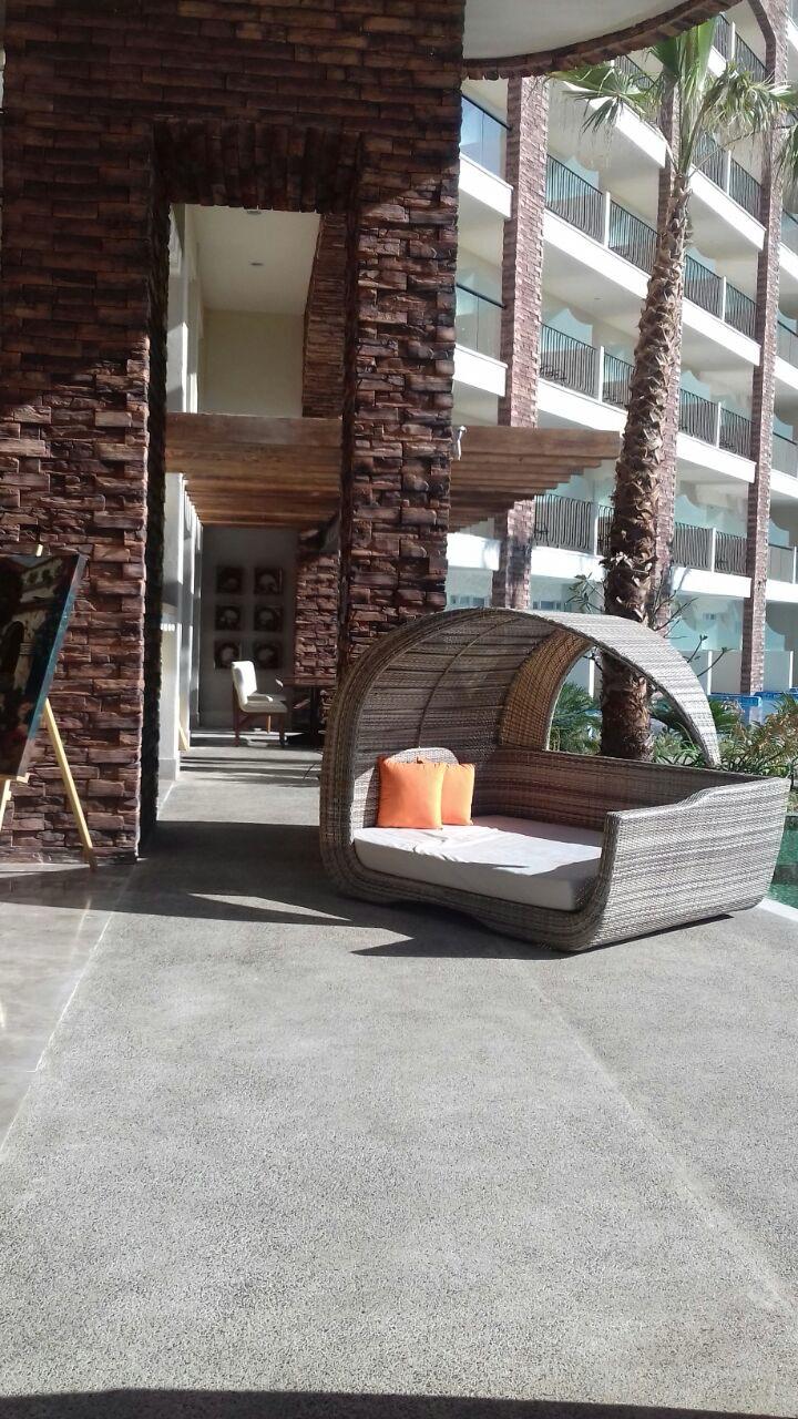 Materiales: Estructura en madera, cojín hule espuma de alta densidad, funda interna, funda externa en tela resistente al sol y la intemperie con cierres reforzados.