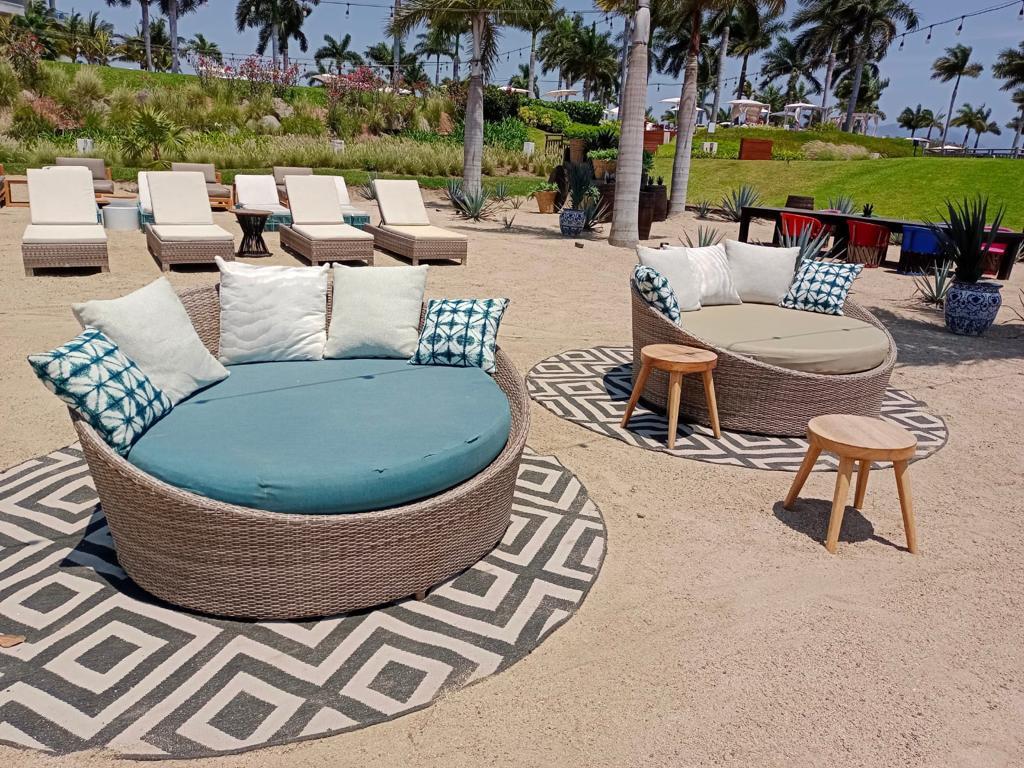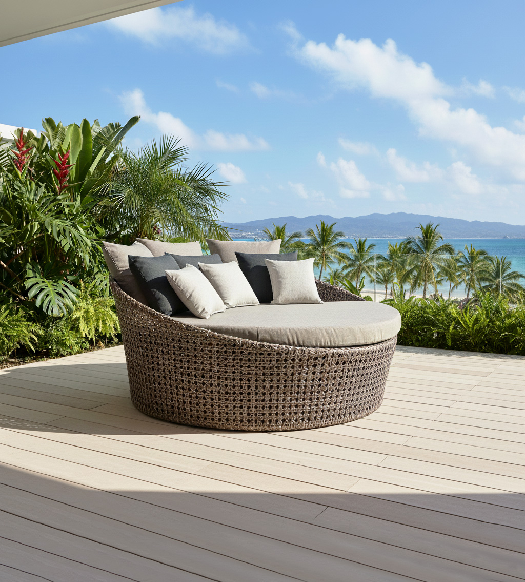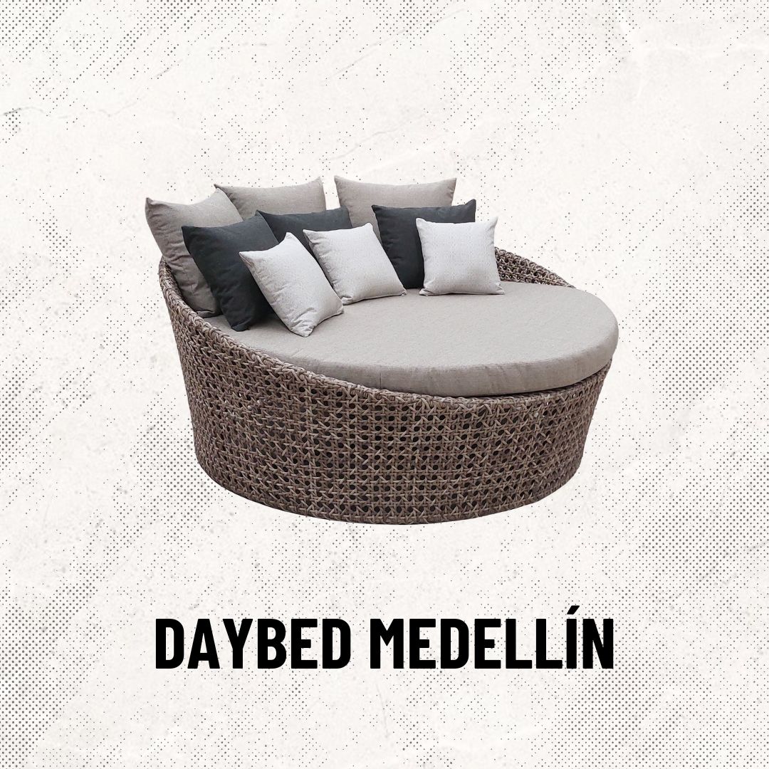 Materiales: Estructura en madera, tejido con rejilla sintética, cojín hule espuma de alta densidad, funda interna, funda externa en tela resistente al sol y la intemperie con cierres reforzados.