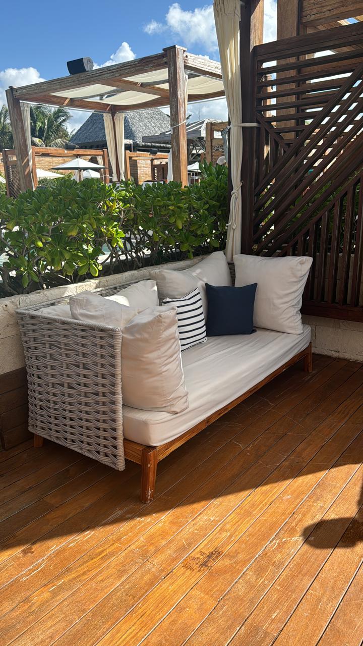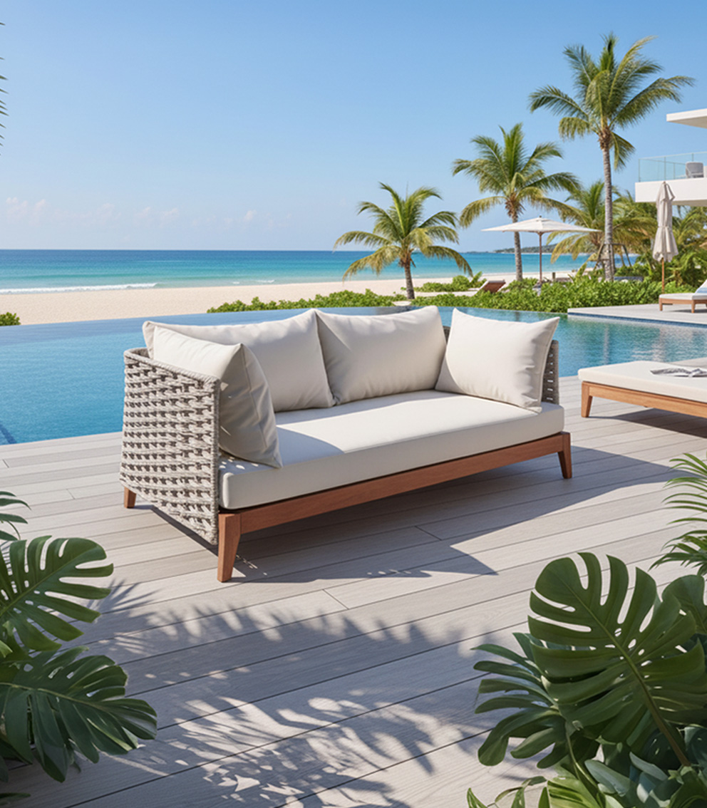 Materiales: Estructura en madera, cojín hule espuma de alta densidad, funda interna, funda externa en tela resistente al sol y la intemperie con cierres reforzados.