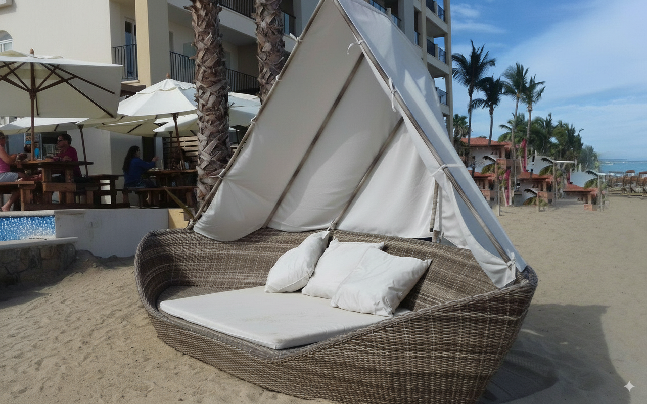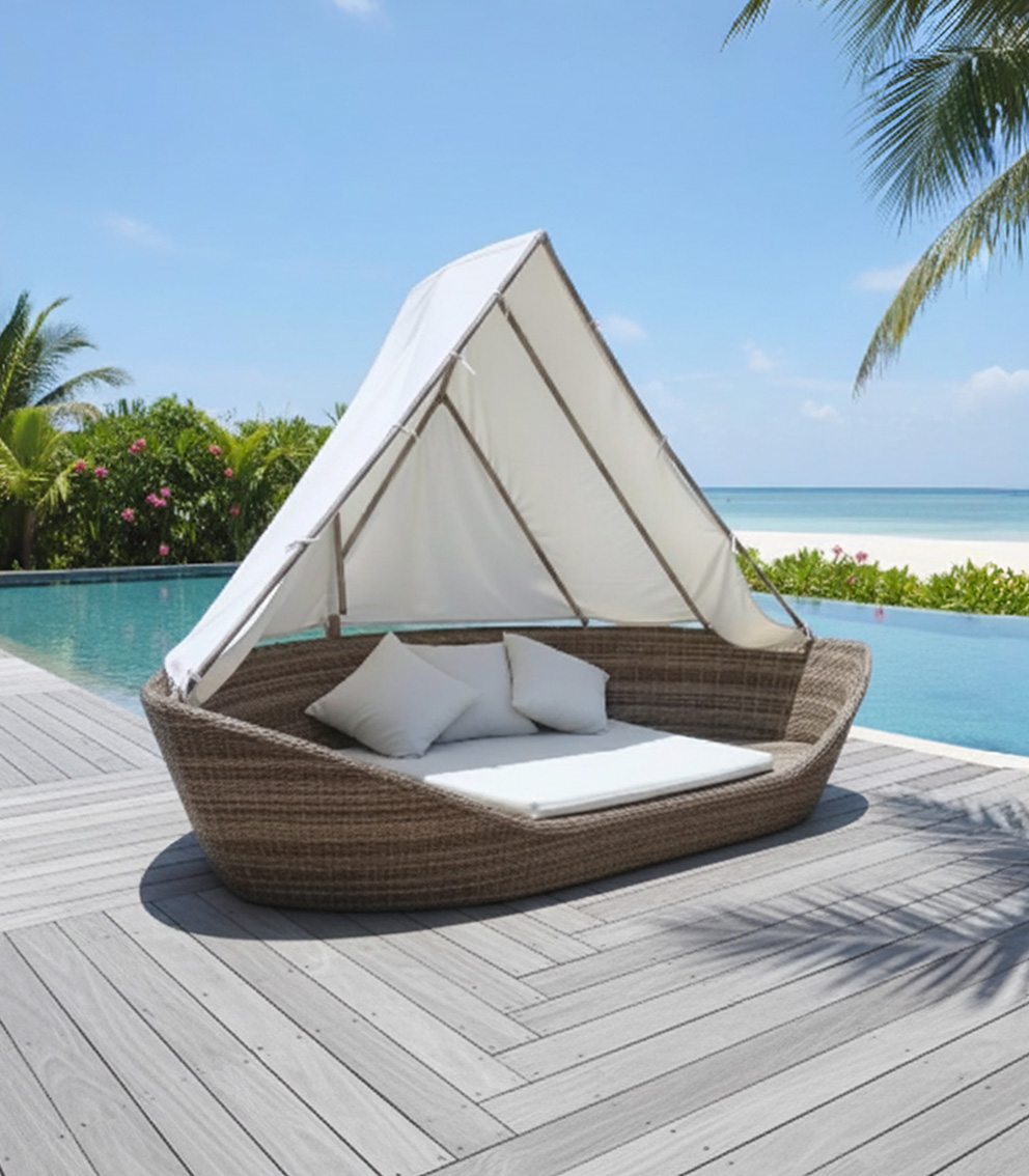 Materiales: Estructura en madera y aluminio, tejido con rejilla sintética, cojín hule espuma de alta densidad, funda interna, funda externa en tela resistente al sol y la intemperie con cierres reforzados.