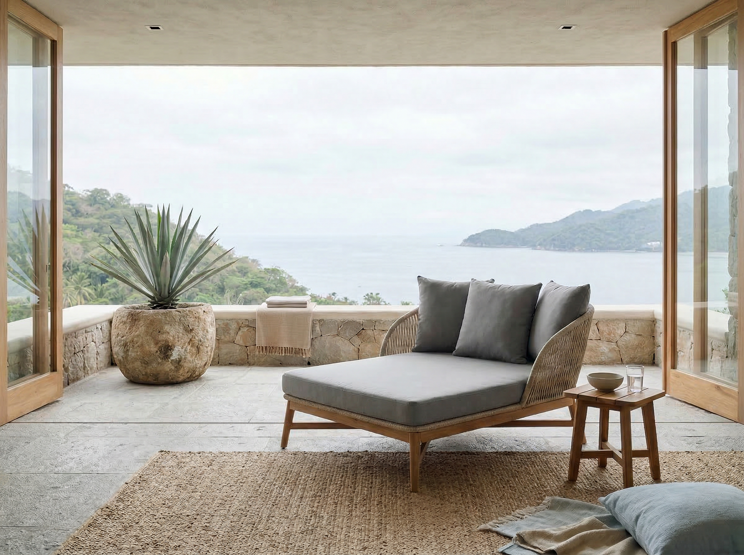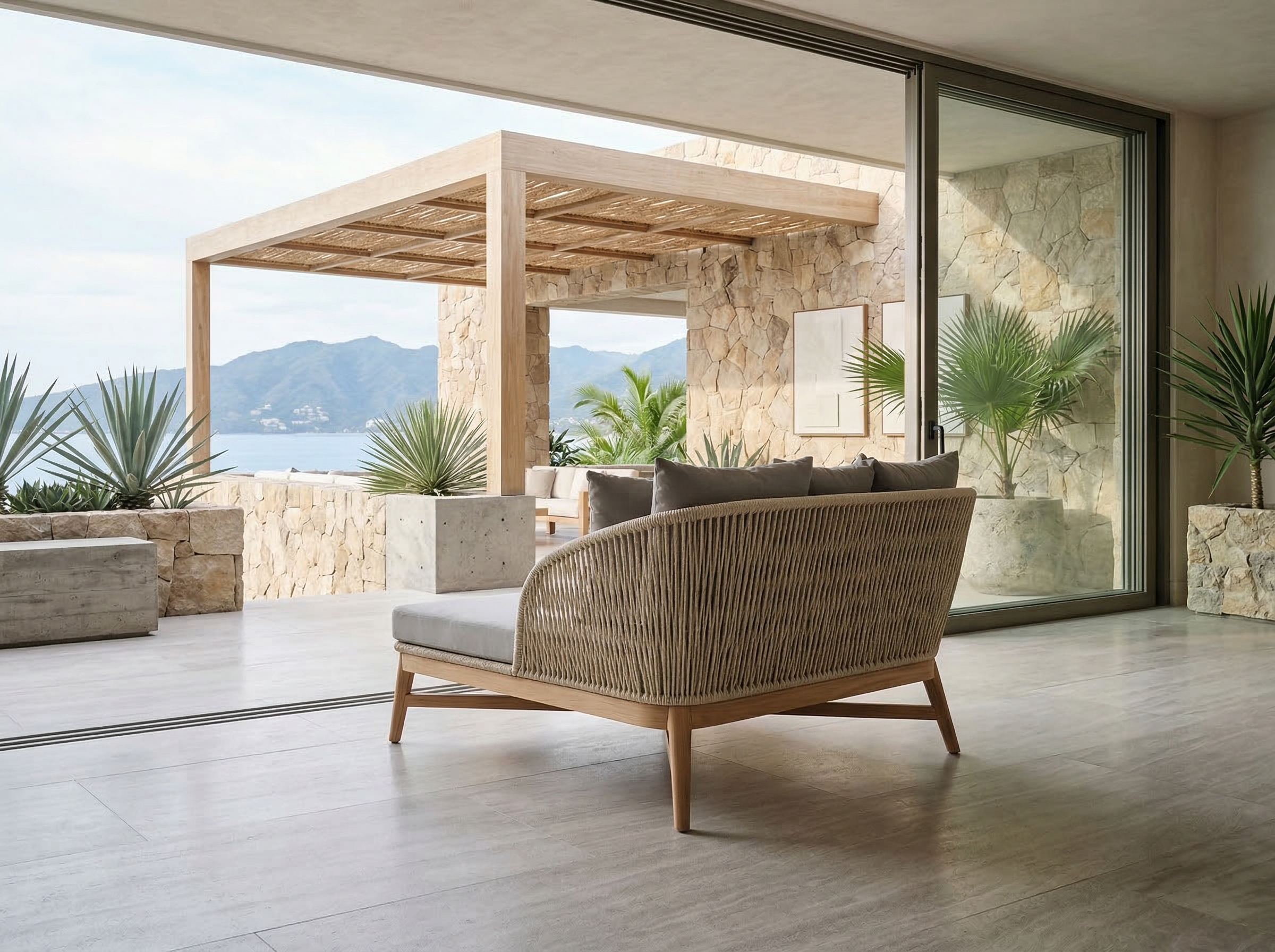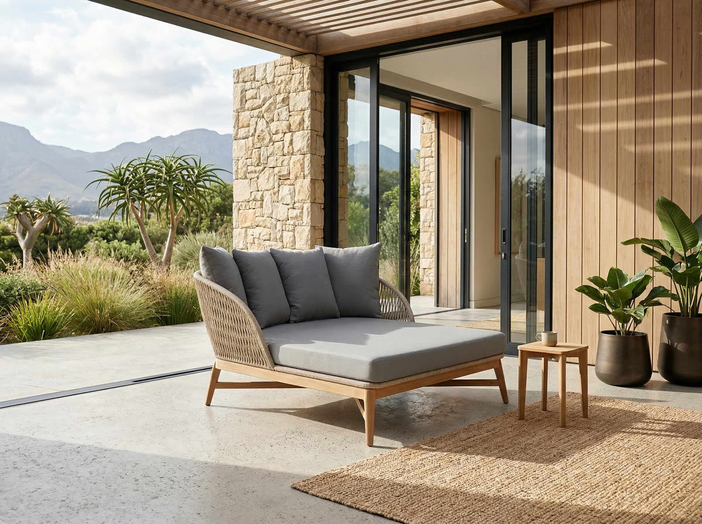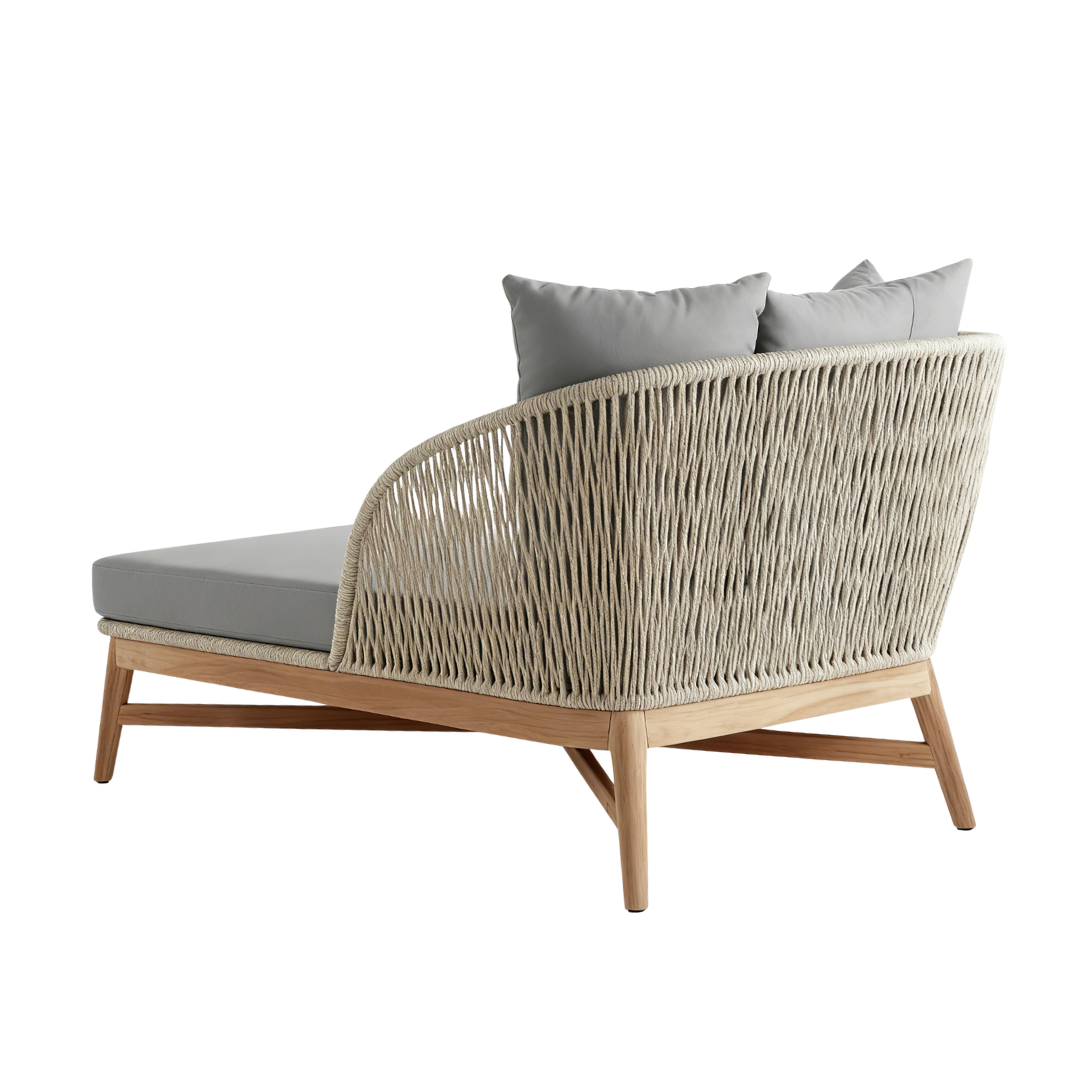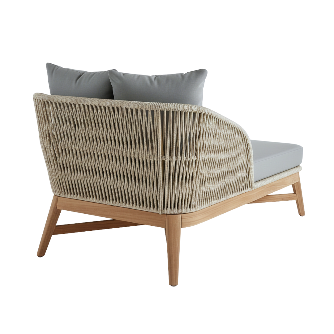 Materiales: Estructura en madera y aluminio, tejido con rejilla sintética, cojín hule espuma de alta densidad, funda interna, funda externa en tela resistente al sol y la intemperie con cierres reforzados.
