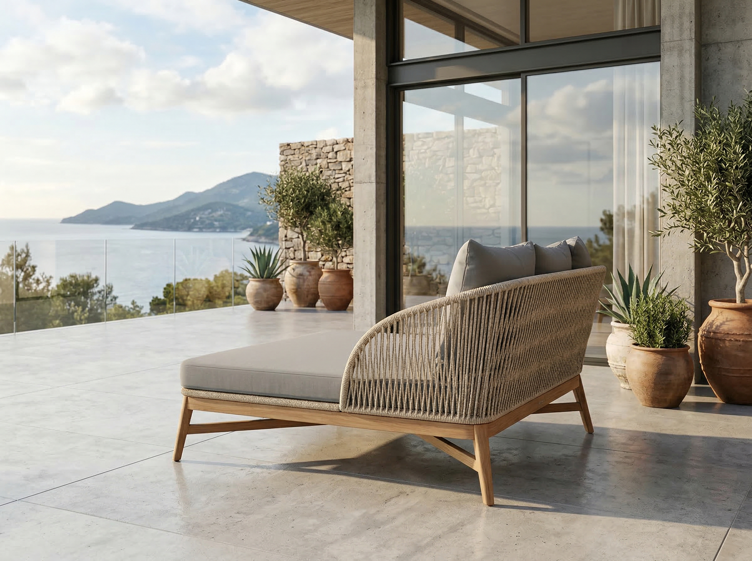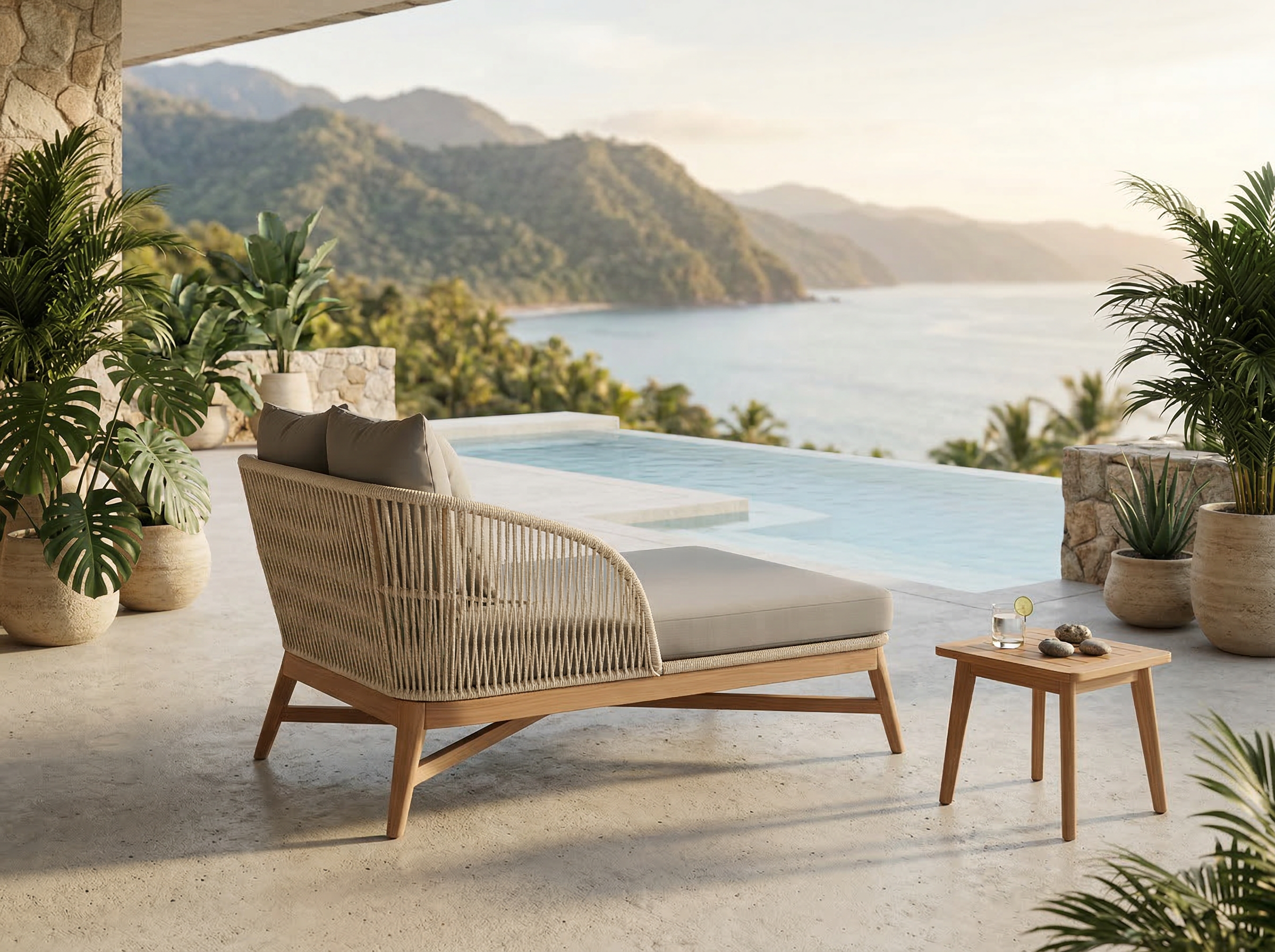 Materiales: Armazón de respaldo fabricado con estructura de aluminio y tejido con rejilla sintética de alta calidad, base de madera de teca, cojíneria hule espuma de alta densidad. Doble funda, funda interna de nailon impermeable, funda externa en tela Sunbrella calidad contract con cierres reforzados.