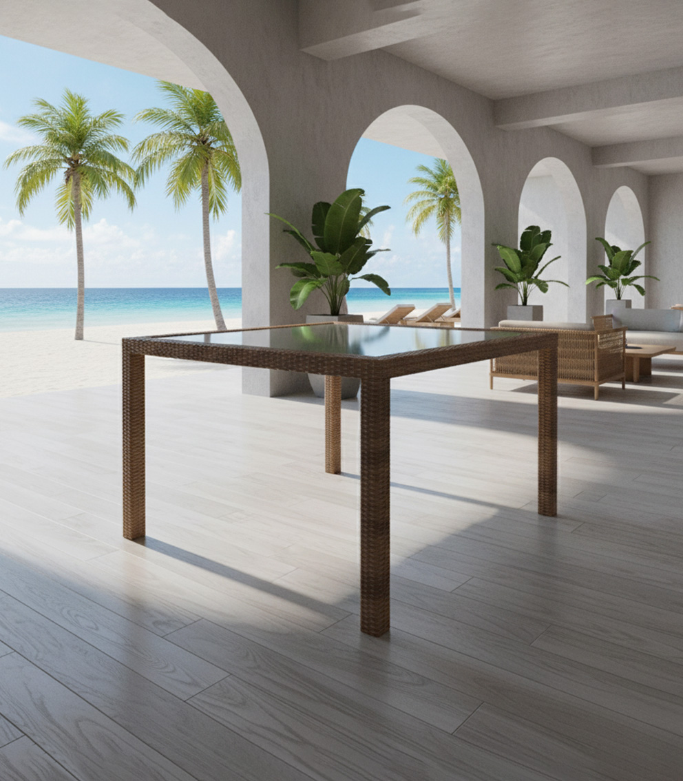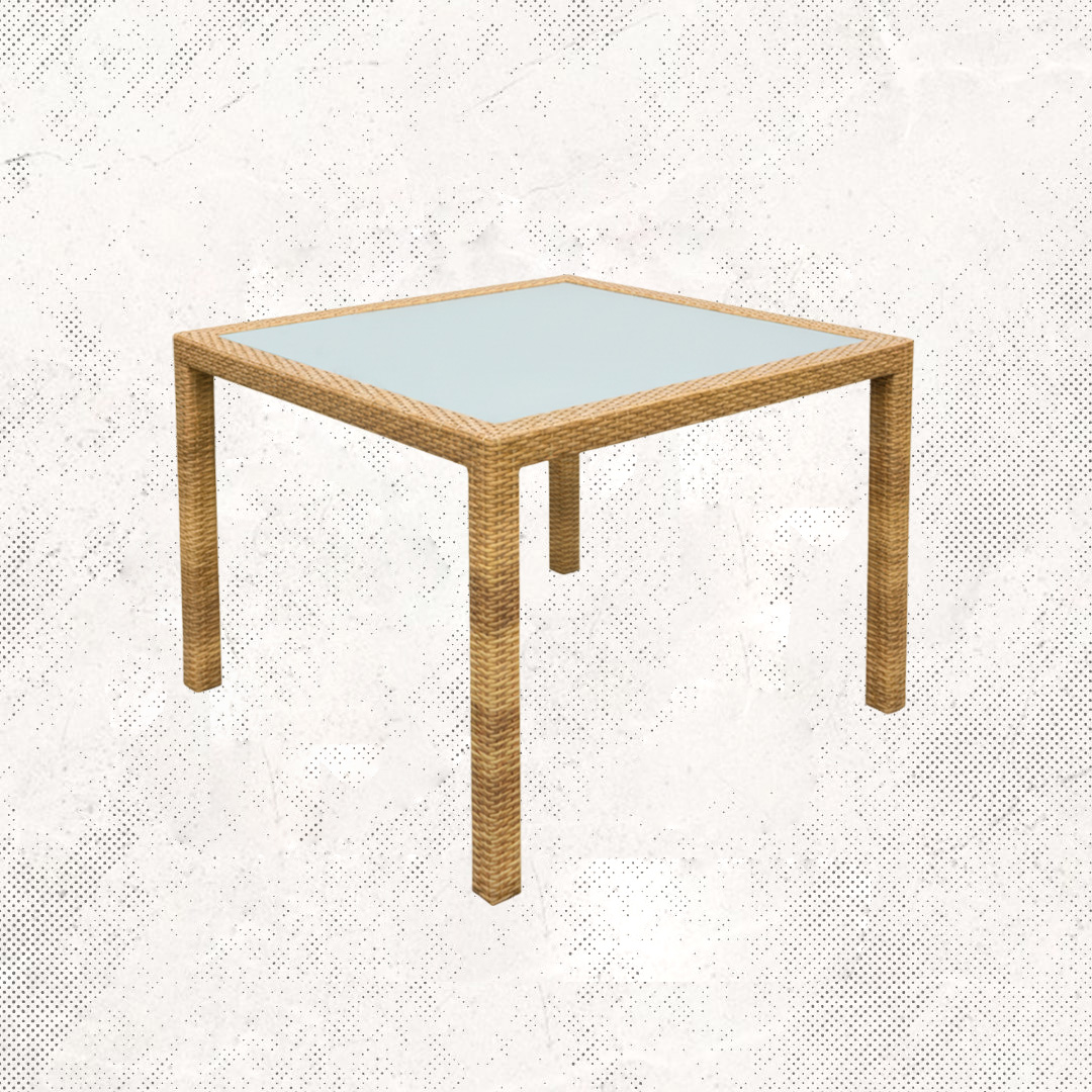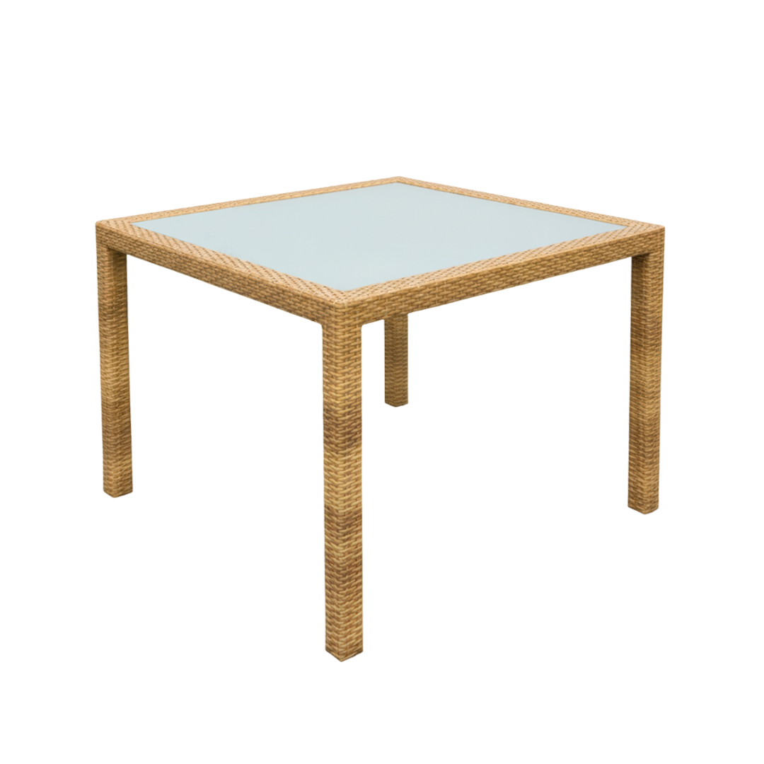 Materiales: Mesa cuadrada para 4 sillas, cubierta de cristal, estructura de aluminio tejida con rejilla sintética de alta calidad