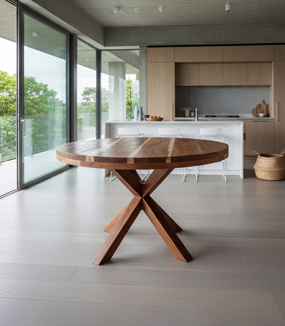Materiales: Mesa circular con cubierta y base de madera, en una gran variedad de materiales.