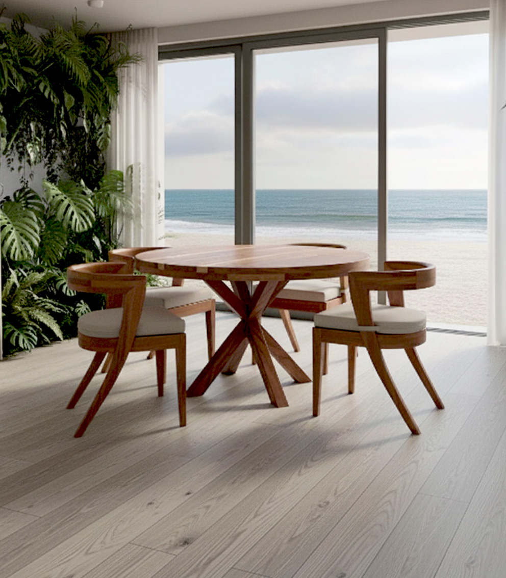 Materiales: Mesa rectangular para 6 sillas, con una base y cubierta de madera, en una gran variedad de materiales.