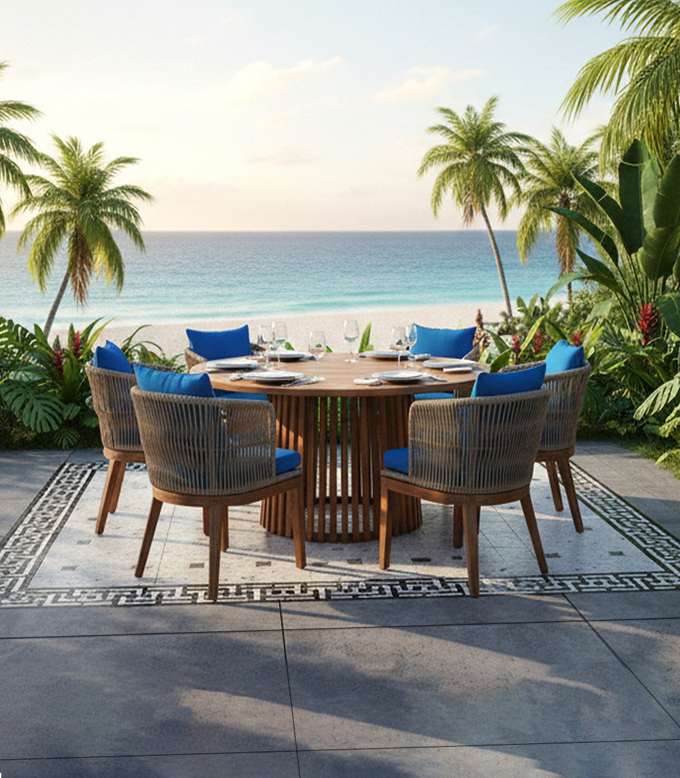Materiales: Mesa redonda para 6 sillas, con cubierta de cristal, estructura de aluminio tejida con rejilla sintética de alta calidad.