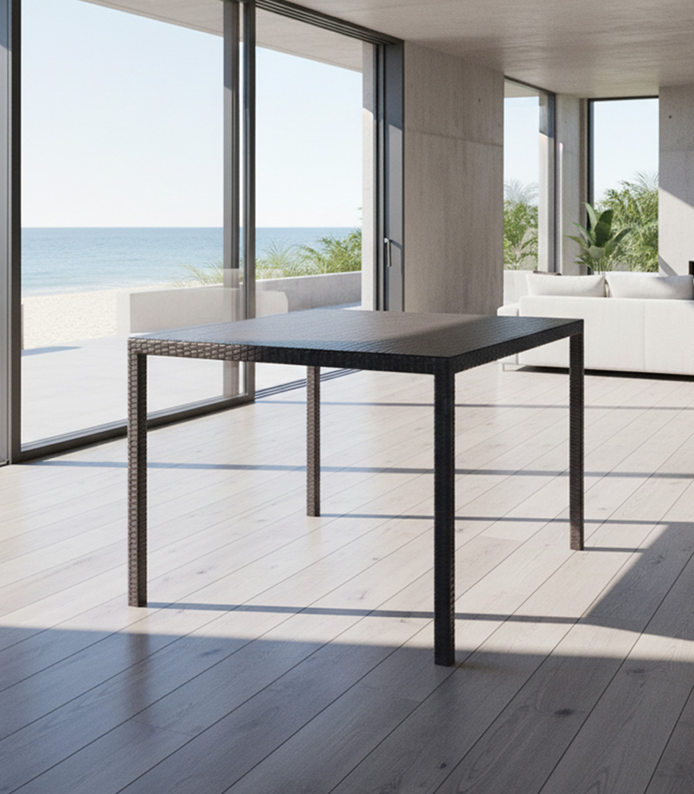 Materiales: Mesa cuadrada para 4 sillas, estructura de aluminio tejida con rejilla sintética de alta calidad.