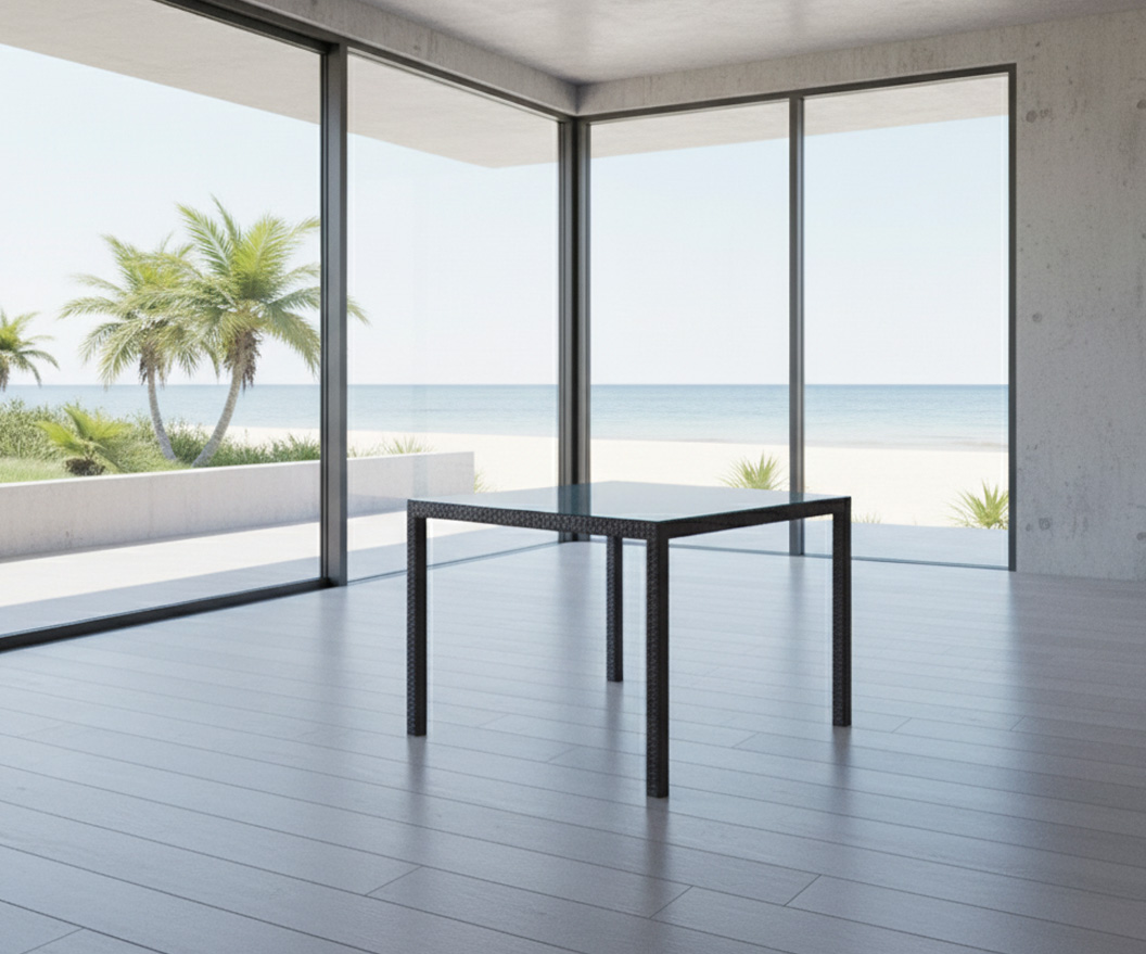 Materiales: Mesa cuadrada para 4 sillas, cubierta de cristal, estructura de aluminio tejida con rejilla sintética de alta calidad