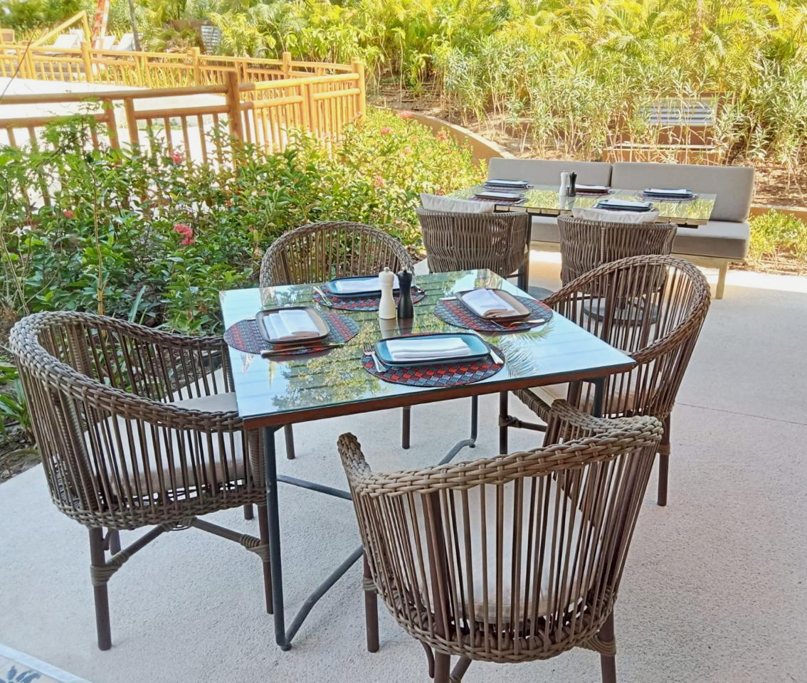 Materiales: Mesa rectangular para 6 sillas, con cubierta de cristal, estructura de aluminio tejida con rejilla sintética de alta calidad.