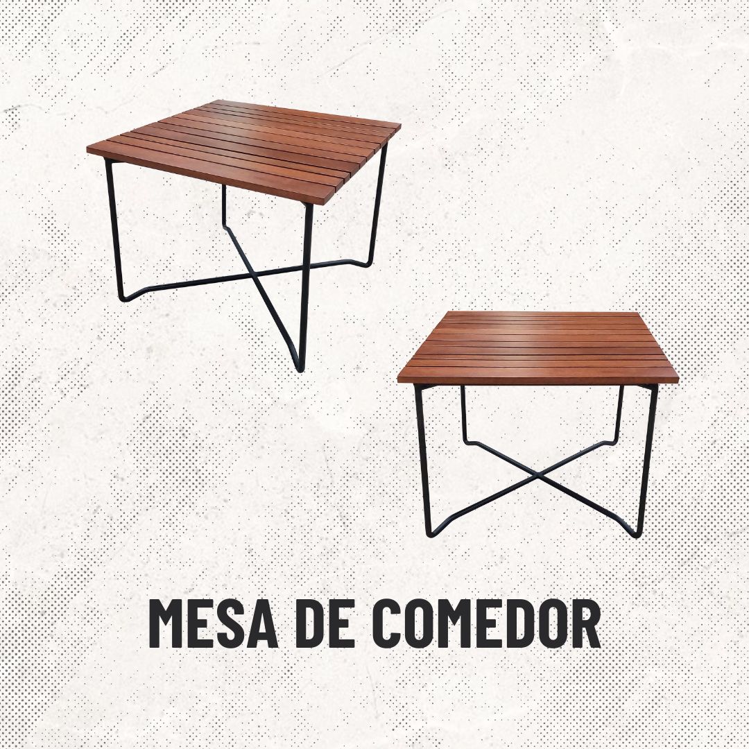 Mesa para 4 sillas, fabricada con estructura de acero y cubierta de madera.